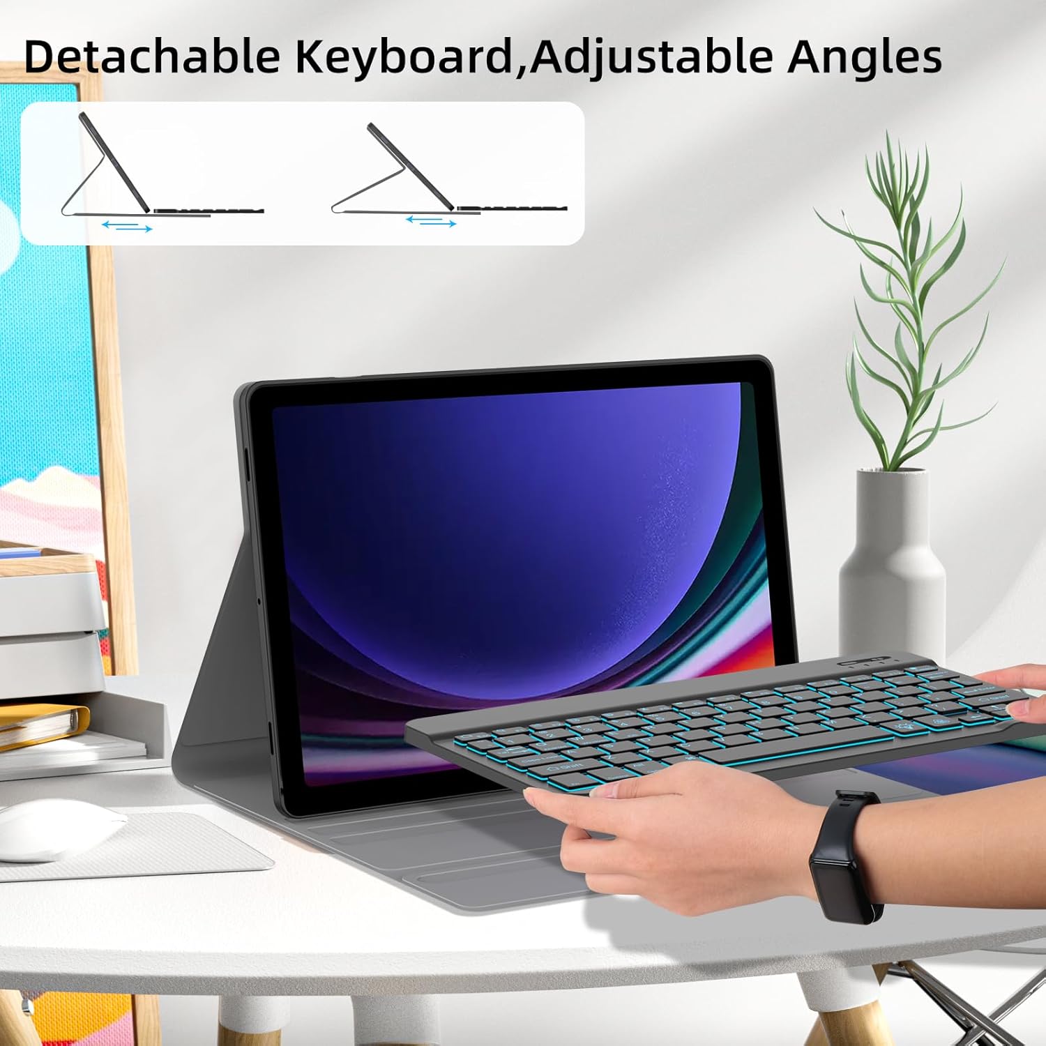 - ăDetachable Magnetic KeyboardăEasily snap the wireless backlit keyboard on/off your Samsung tablet case. Adjustable angles adapt to your typing or viewing needs.