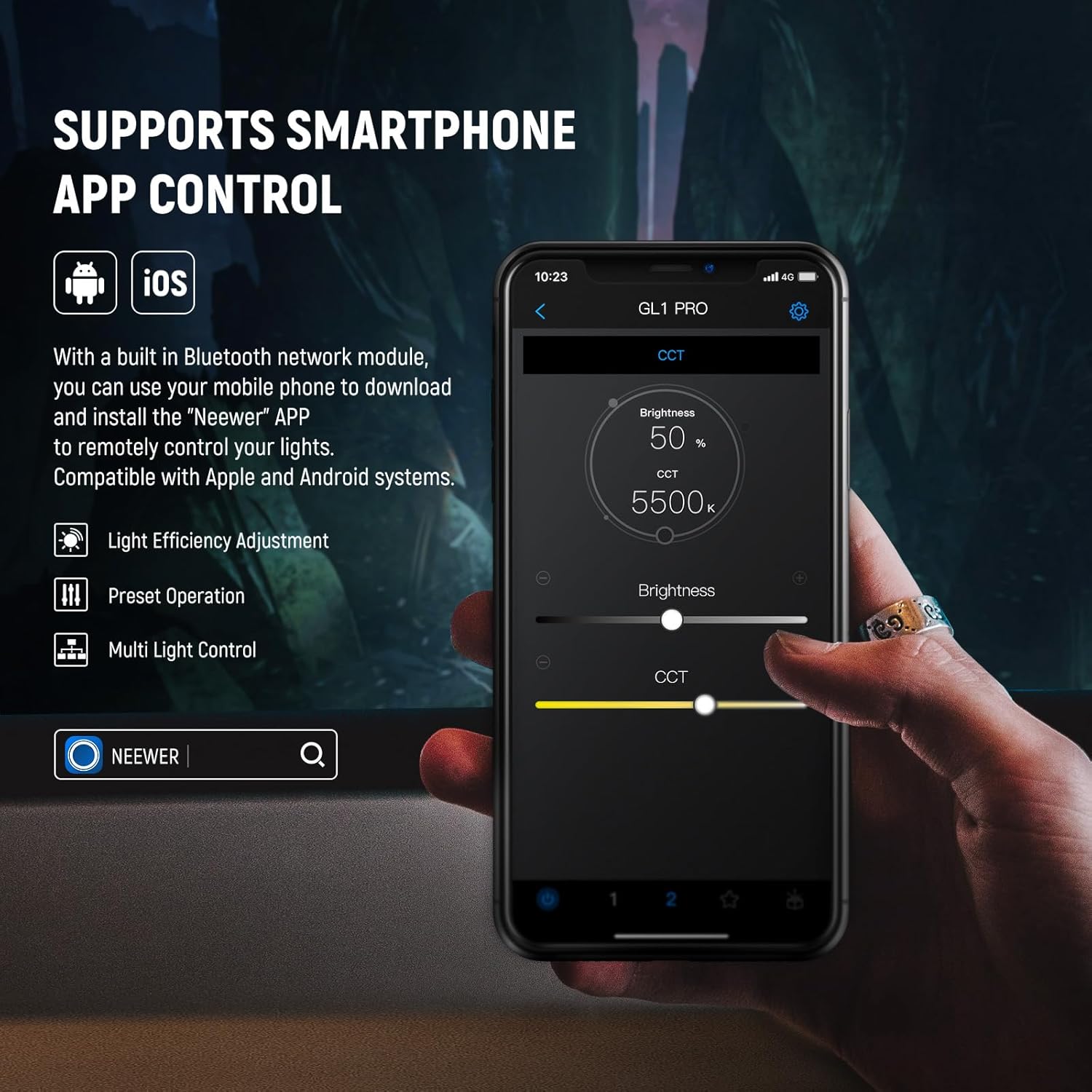 - 【Upgraded to 3 Ways App Connections】 Way 1.【No Wifi Connect Needed 】Plug the 2.4G USB dongle into your PC/Mac and download the "NEEWER Live 2.4G" App to enable remote control. Way 2.【Wifi Connection 】Requires to download the latest version (Windows V1.2.0 & macOS V1.4.0) of the "NEEWER Live" App on PC/Mac or pairing with Stream Deck (Only compatible with Elgato). Way 3.【Bluetooth Connection】 With the built in Bluetooth module, you can use your phone to control the lights via the "NEEWER" App
