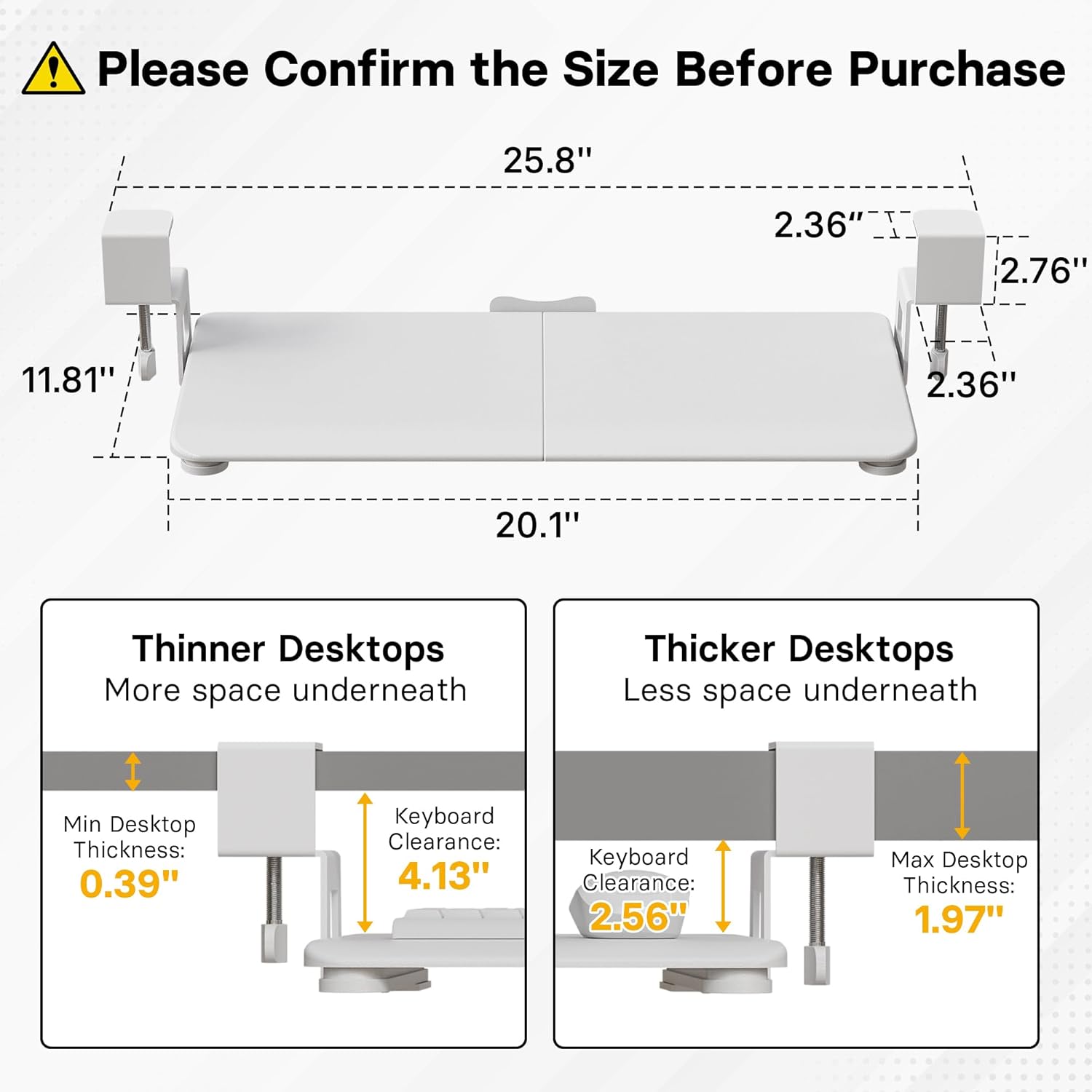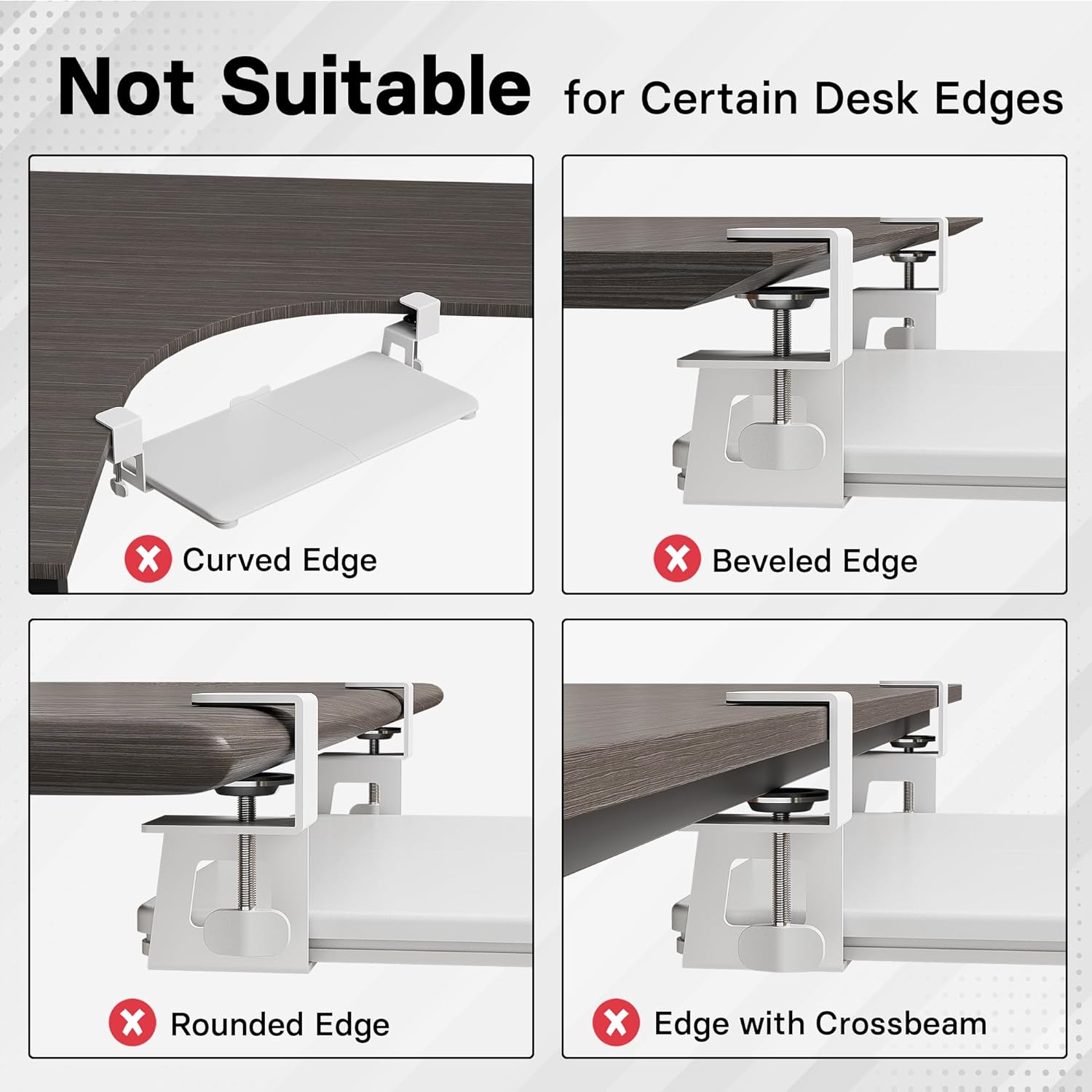 - ❗️ CHECK DESK COMPATIBILITY BEFORE PURCHASE – This keyboard tray won’t work with desks that have curved, beveled, or rounded edges, or crossbars/support beams underneath. Please check the product images to ensure your desk has a flat, unobstructed underside for clamp installation