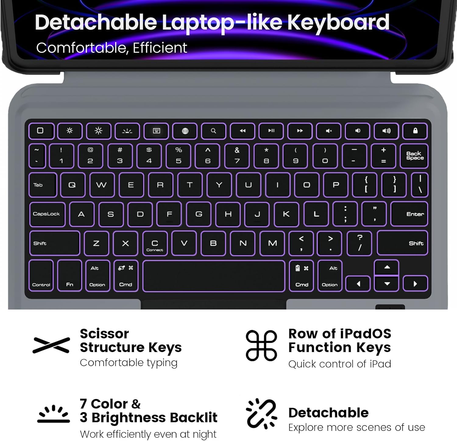 - Enhanced Backlit Keyboard - iPad Pro 11 inch case with keyboard Illuminates your iPad experience with our rechargeable backlit keyboard featuring 7 vibrant colors and 3 brightness levels. Effortlessly navigate in low-light conditions and enjoy a quiet, comfortable typing experience.