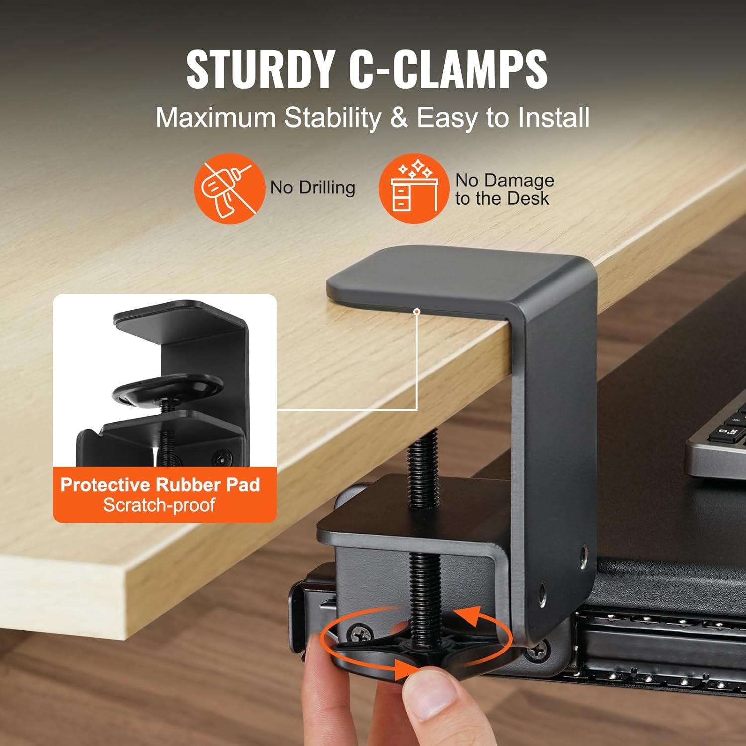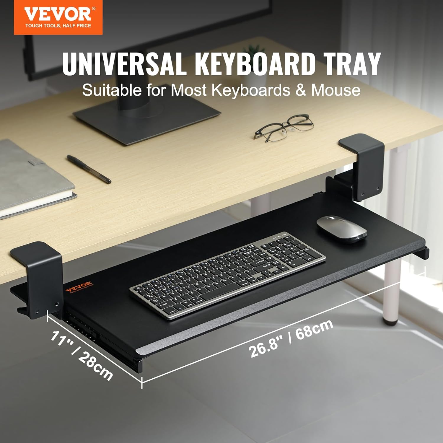 VEVOR Clamp on Keyboard Tray Under Desk, Desk Keyboard Tray Slide Out with Sturdy No-Drill C Clamp Mount, Large 26.8 x 11 inch Slide-Out Computer Drawer for Typing in Home, Office Work