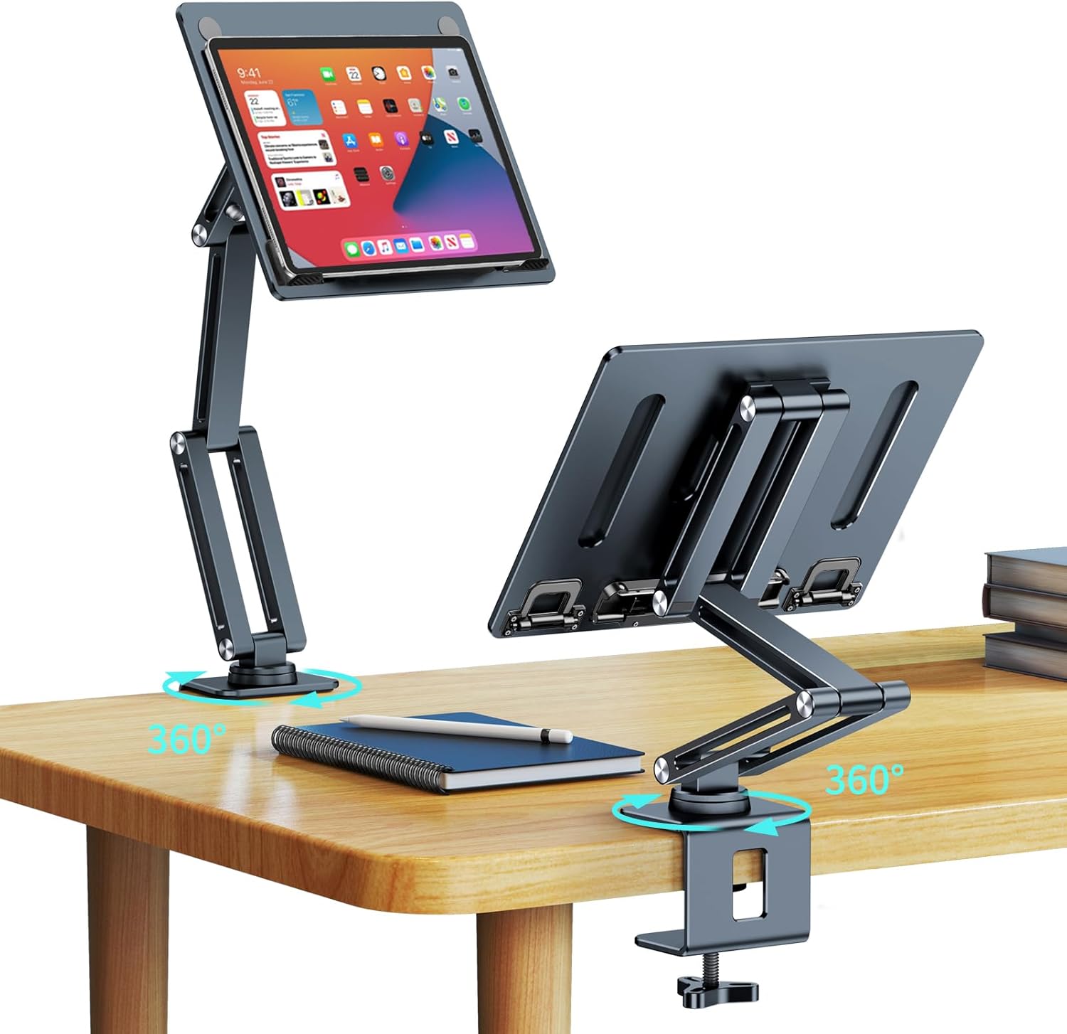 - Stable and Durable: This iPad stand uses industry high standard dual spindle design strong damping force, support does not fall down. Aluminum alloy material is solid and durable, anodized high hardness aluminum alloy CNC finely carved, outstanding texture. Damping pivot arm, the middle damping pivot strong upward reaction force, it will not loosen or swing when using or clicking the screen for a long time