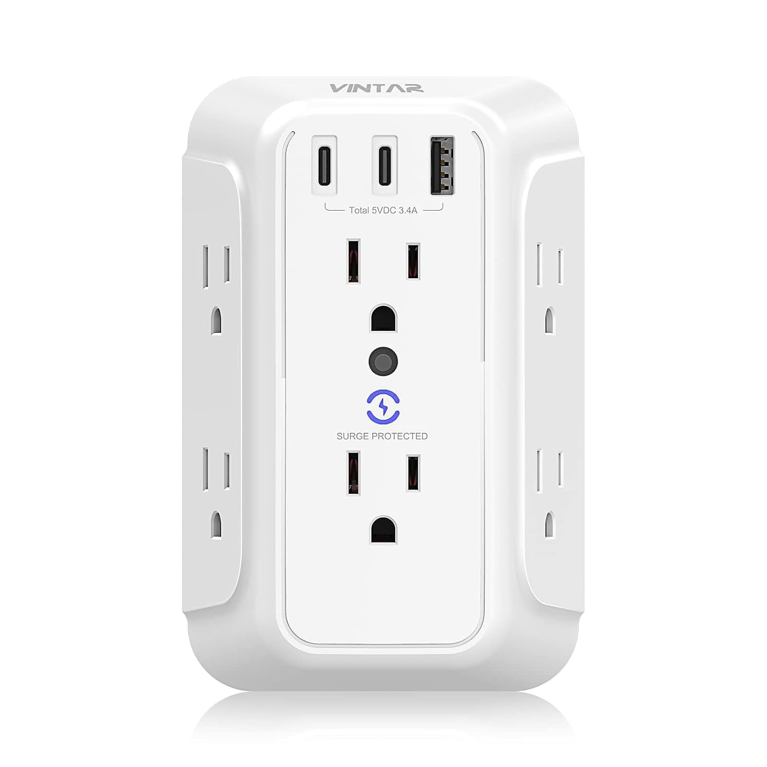 Surge Protector Outlet Extender, VINTAR 6 Outlet Splitter with 3 USB Charging Ports (2 USB C Ports), 900J Multi Plug Outlet Power Strip, 3-Sided USB Wall Charger for Home Office Dorm Room Essentials
