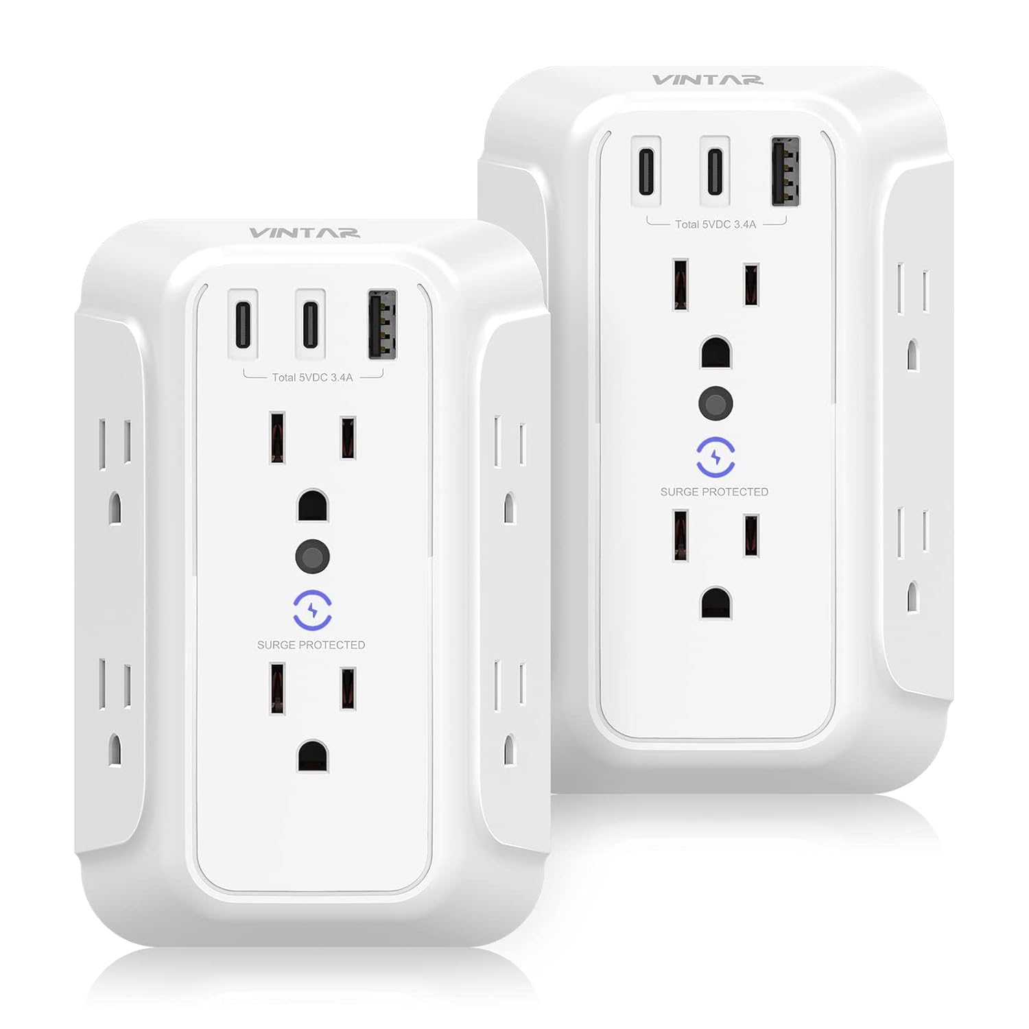 [2-Pack] Surge Protector Outlet Extender, VINTAR 6 Outlet Splitter with 3 USB Charging Ports (2 USB C),900J Multi Plug Outlet Power Strip, 3-Sided Usb Wall Charger for Home Office Dorm Room Essentials