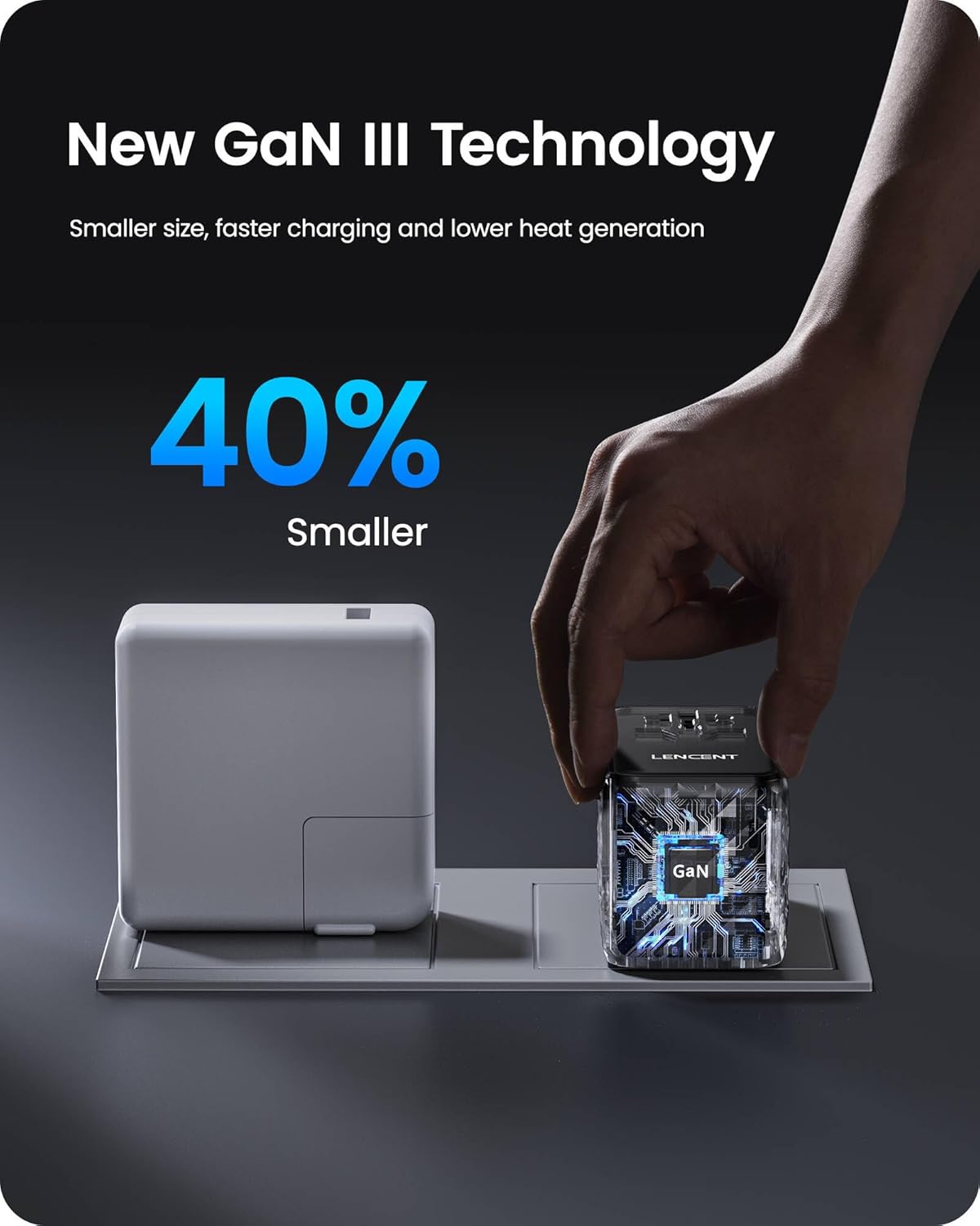 - 【Advanced GaN III Technology】GaN III technology reduces the size and density of the adapter while increasing charging efficiency. Thanks to the advanced GaN III Technology which has a built-in multi-protection system and high quality microchips, this travel adapter achieves faster and lower temperature generated charging performance with higher efficiency compared to traditional silicon chargers.