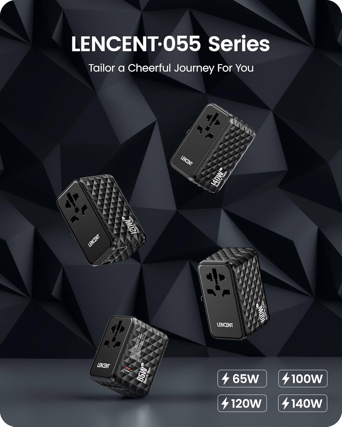 LENCENT 120W Universal Travel Adapter, GaN International Travel Adapter with 3 USB-C 1 USB-A Ports, Worldwide Fast Charger for Cameras Phones, All in One Power Converter for USA EU UK AUS Black