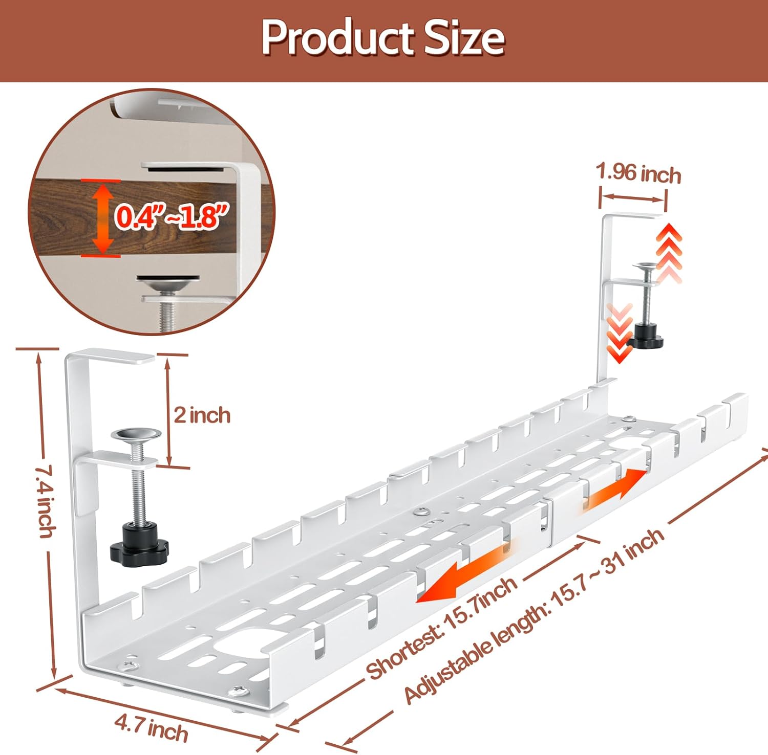 - 【No Drilling Required Design】Cable organization tray length can be adjusted (from 15.7"-31"), 4.7" wide, can easily put down multiple power strips, Iphone/PC chargers, and with the use of cable ties can be more neatly placed up these things. No drilling and no adhesives required for installation, very easy to install and remove.