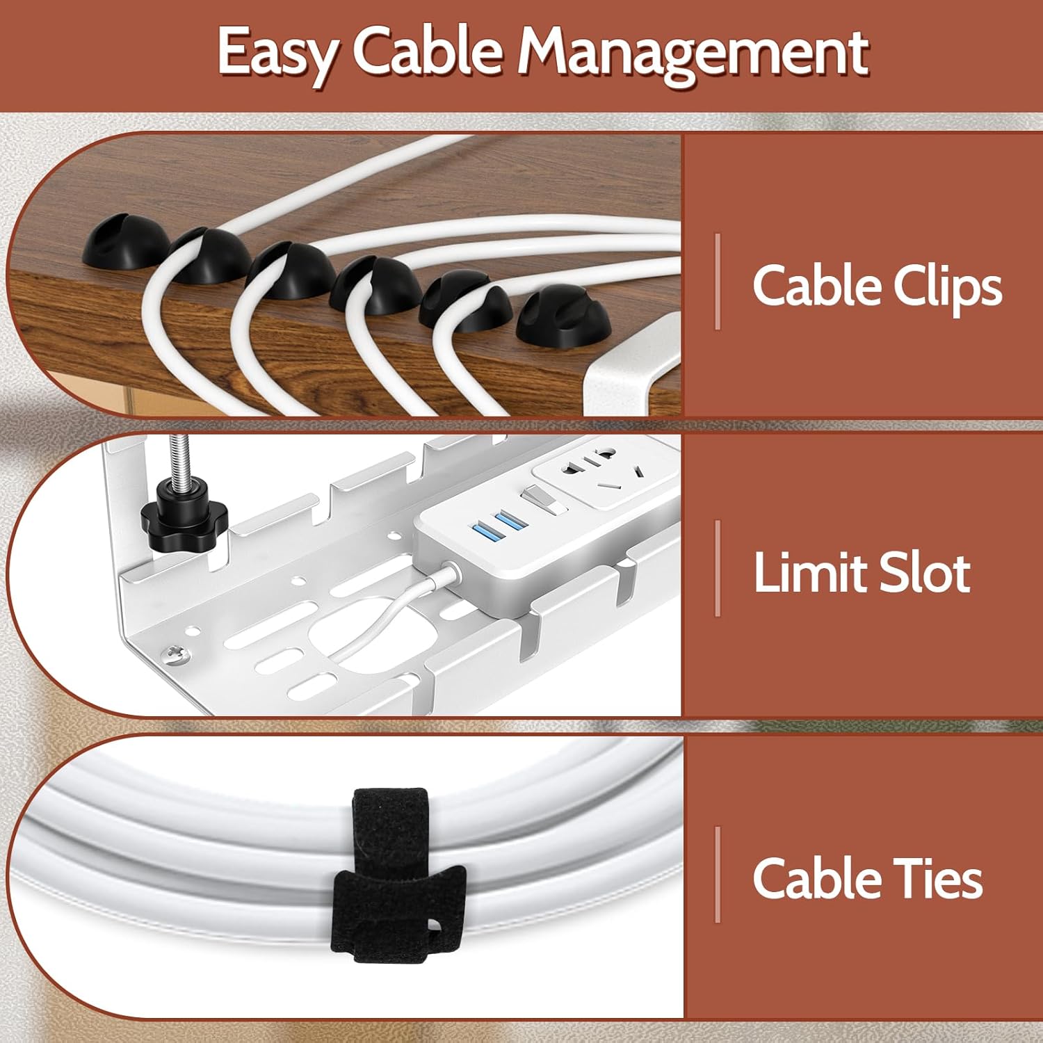 - 【Multi-use Cord Organizer 】Comes with cable holders clips to better organize the charger, the clips have 3M tape on the back, don't need extre adhesives for installation. Anti-friction pads act on the C-shaped clips and desktop contact position to protect against damage to the table surface. All screws and nuts are universal, don't need tobuy more than one type when missing or damaged one.