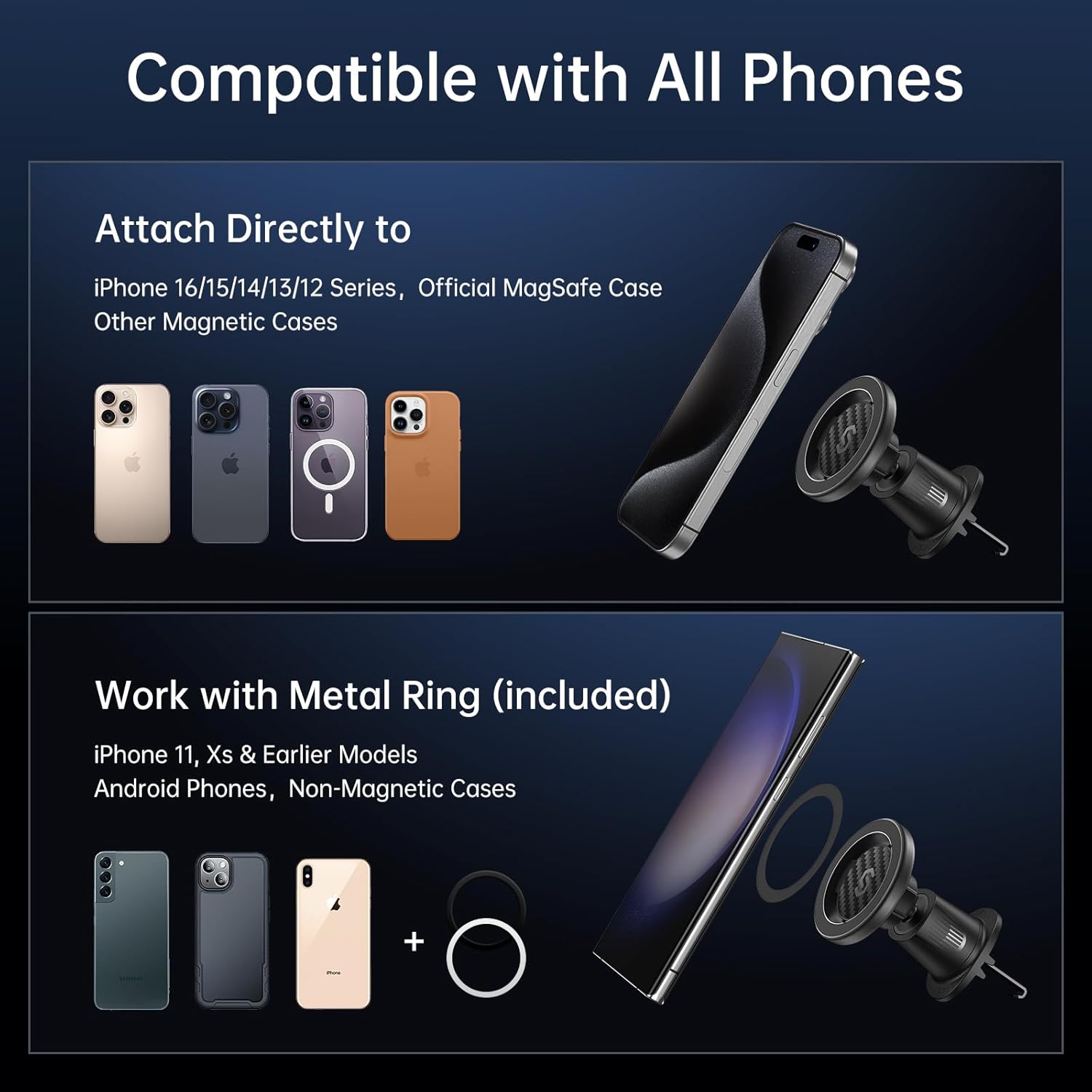 - ăWide AdaptabilityăThe MagSafe car phone holder can place directly on iPhone 16, 16 Pro, 16 Plus, 16 Pro Max, 15, 15 Pro, 15 Plus, 15 Pro Max, 14, 14 Pro, 14 Pro Max, 14 Plus, iPhone 13, 13 Pro, 13 Pro Max, 13 Mini, iPhone 12, 12 Pro, 12 Pro Max, 12 Mini & MagSafe cases. Additionally, it is compatible with non-magnetic phones and standard phone cases with metal rings (provided) on their backs.