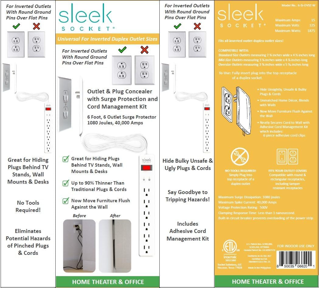 Sleek Socket Original & Patented Ultra-Thin Outlet Concealer with Cord Concealer Kit, Flat Extension Cord with Multi Outlets Surge Protector Power Strip, Ideal for Home Office and Home Theater