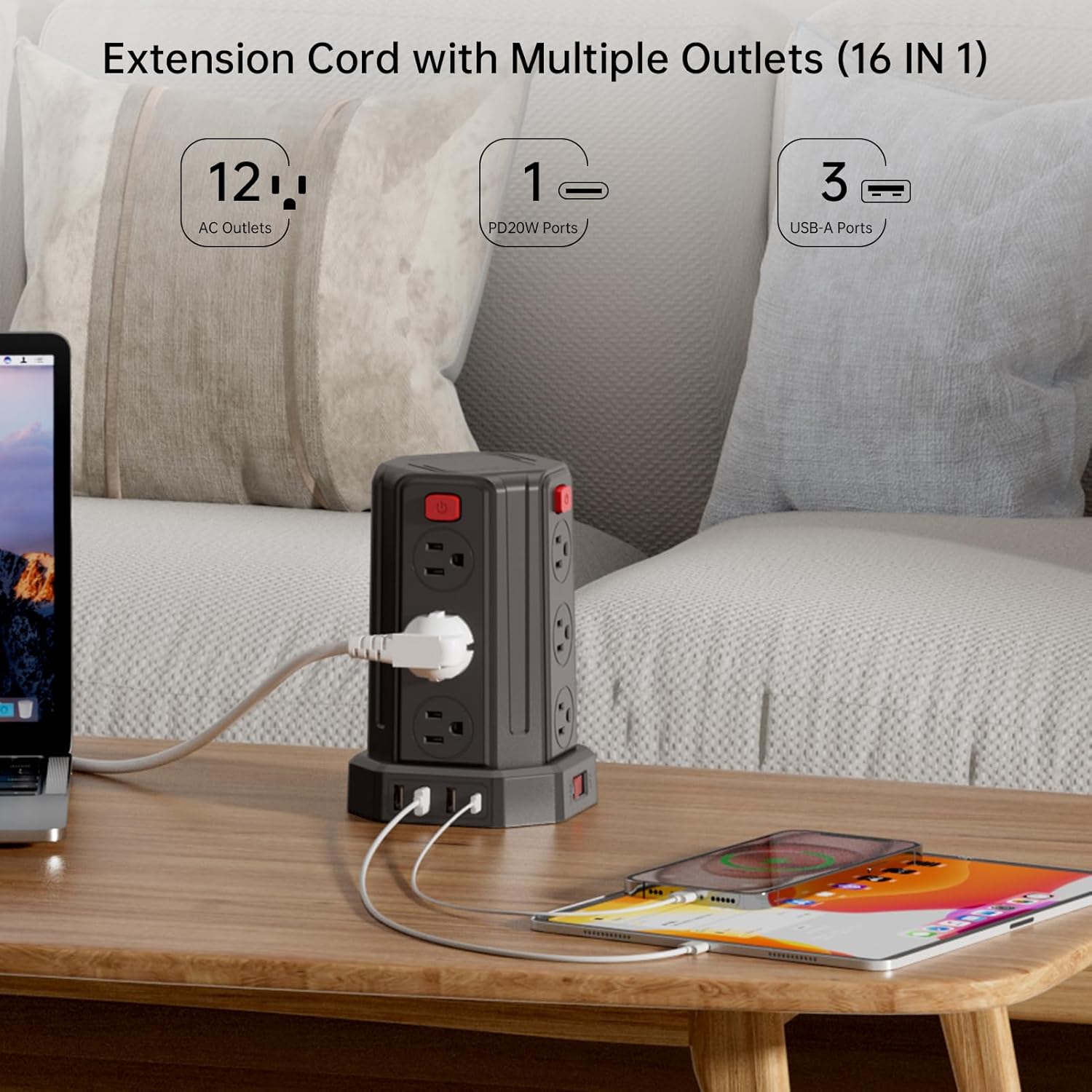 - 【16-in-1 Surge Protector Power Strip Tower with Long Extension Cord】 Maximize workspace efficiency with this versatile 6.5FT/10FT/16.4FT heavy-duty extension cord power strip, combining surge protection and extended reach. Its compact tower design organizes 12 AC outlets + 4 USB ports (3 USB-A + 1 Type-C) to declutter desks in homes, offices, or dorms. The extended surge protector outlet eliminates cable chaos while providing flexible placement anywhere indoors.