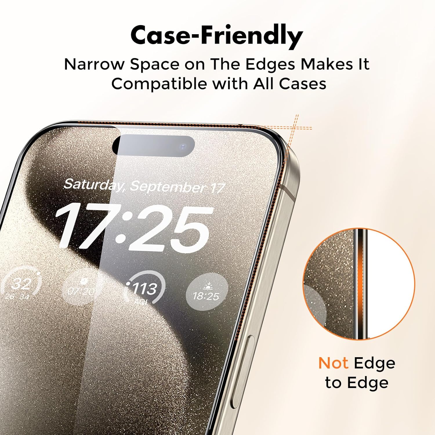- Perfect fit & Case Friendly: Designed for iPhone 15 Pro Pro 6.1" (2023). These protectors are Slightly smaller than the screen to avoid interfering with Face ID or the front camera, ensuring case compatibility and preventing bubbling.