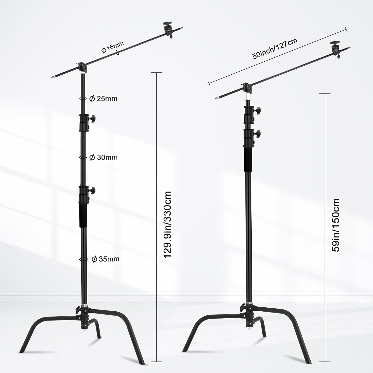 - 【Adjustable Stable C-Stand】Height of center stand column can be adjusted from 4.92ft/150cm to 10.8ft/330cm, Holding arm length:4.2ft/128cm. The center stand has built-in buffer spring, which can reduce the impact of sudden fall of the installed equipment and protect the equipment when adjusting the height