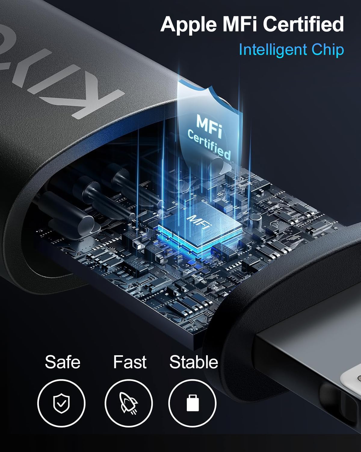 - Apple MFi Certified Charging Cable: The MFi certified cable is compatible with all Apple system devices with lightning ports, and the built-in smart chip ensures safe and fast charging and data transfer. Current up to 2.4A, transmission up to 480Mbps, quickly transfer images, music, videos, and files within seconds.
