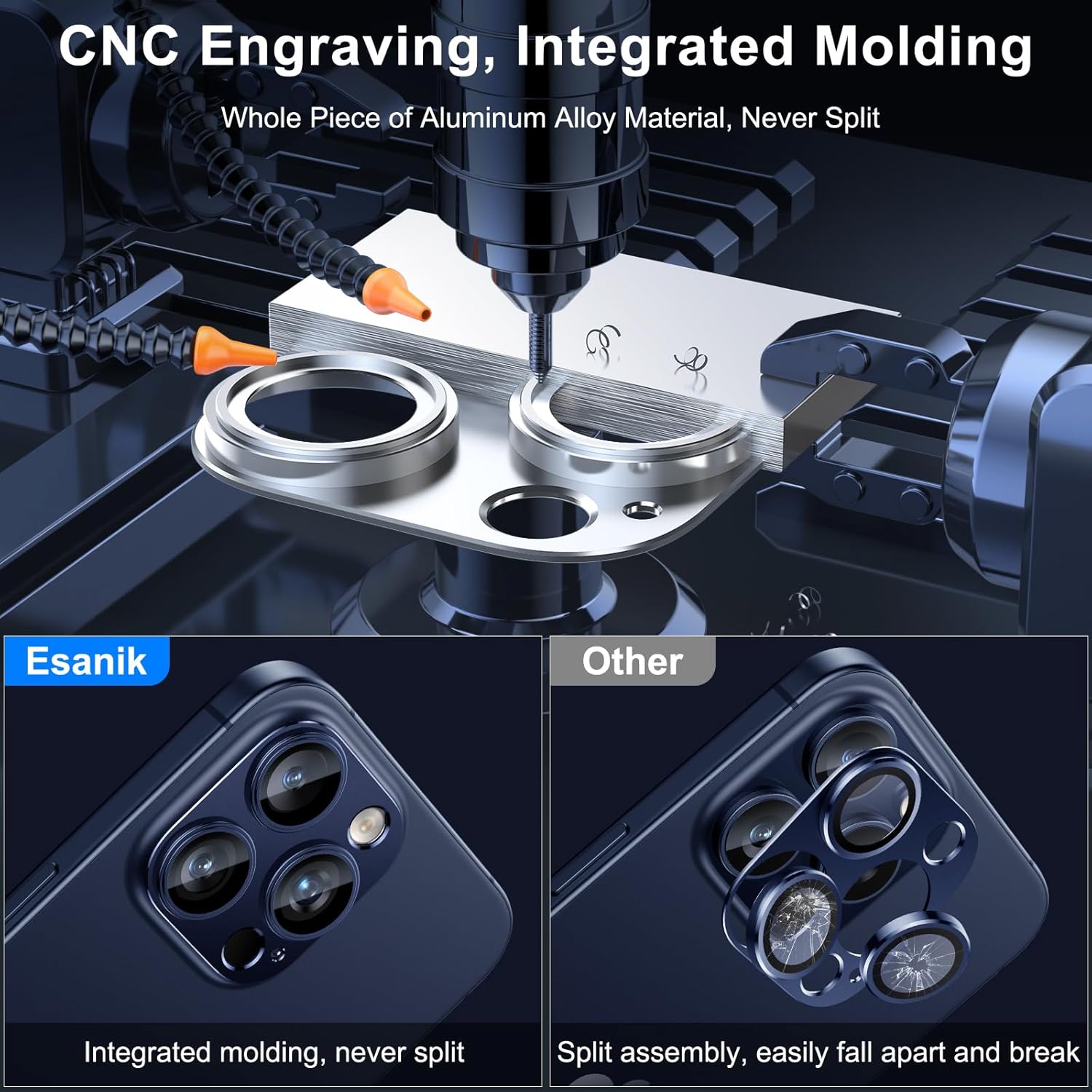 - ăCNC Engraving & Integrated Moldingă Esanik 2023 Upgrade Version iPhone 15 pro max / iPhone 15 Pro Cam Cover is precisely carved from whole piece of high-quality aluminum alloy, firm and long lasting. Bid farewell to the split and falling apart issues resulting from the conventional split assembly process.