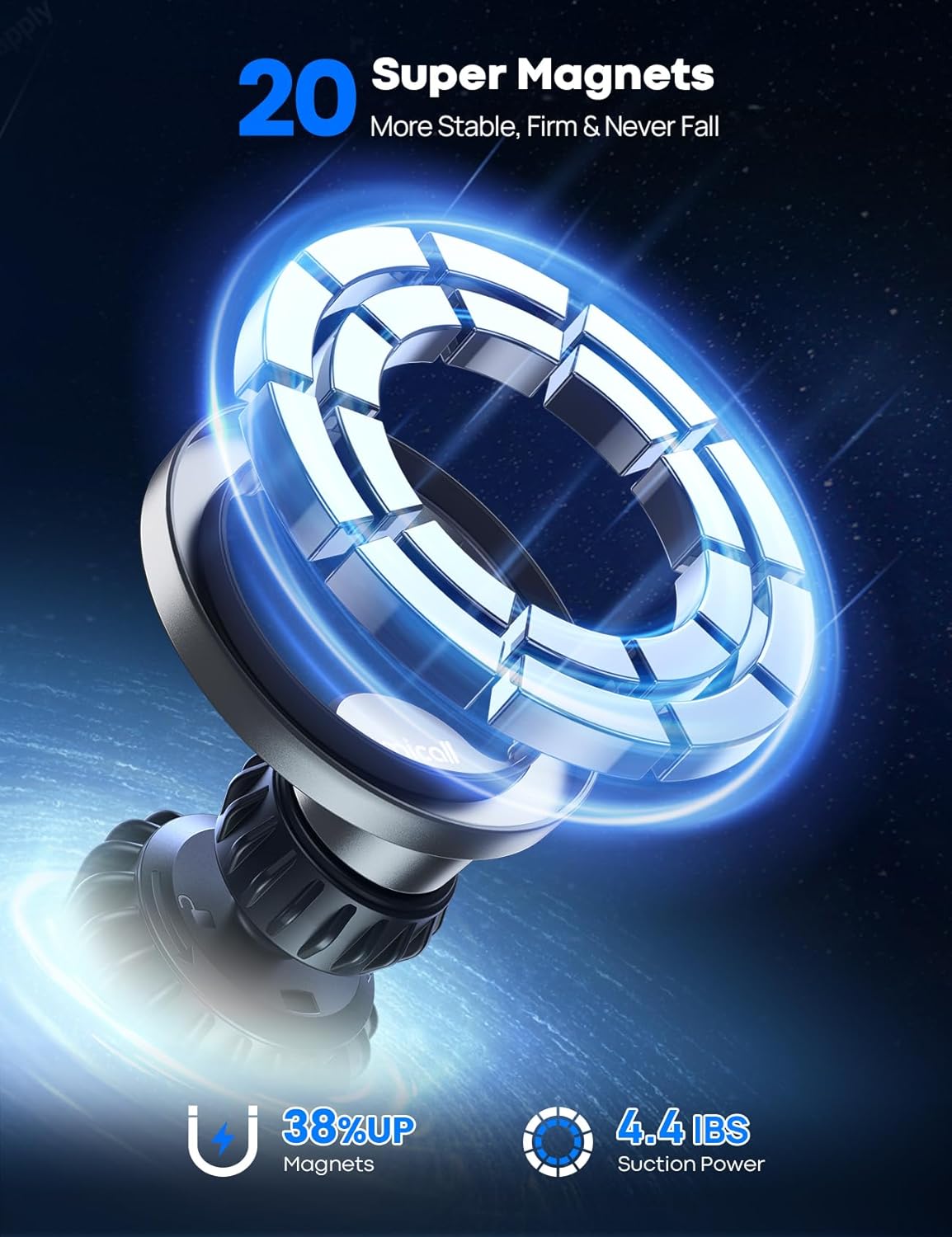 - 20 Upgraded Magnets: 2024 Upgraded Magnet Layout - 38.7% Power Boost! Lamicall car mount for Magsafe built-in 20 upgraded N52 super magnets, which can easily hold items up to 4.4 lbs. Super powerful magnets ensure a firm hold on your cell phones. Never afraid of falling off even braking strongly, taking sharp turns or driving on rough roads. A practical MagSafe accessory, car accessory.
