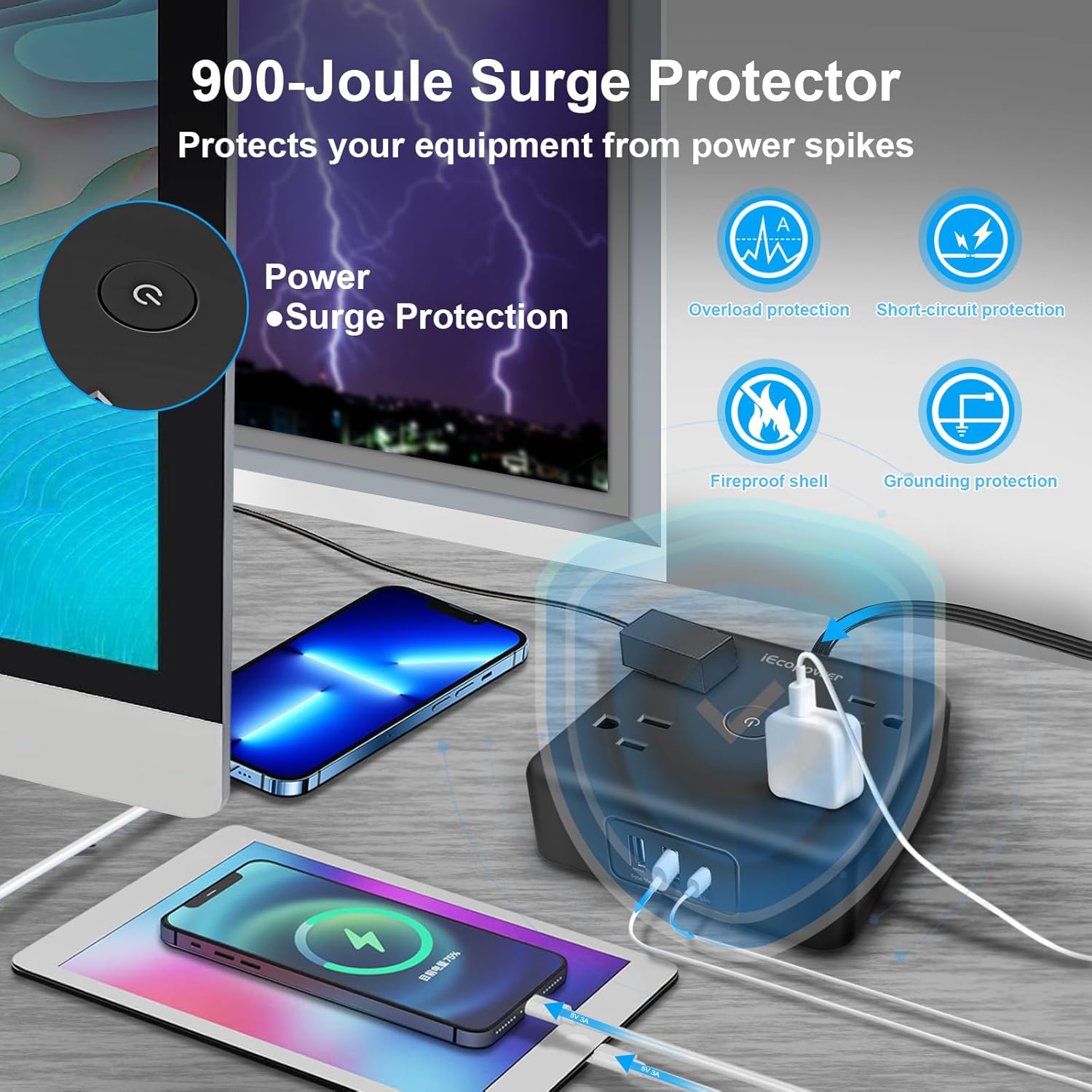 - 【Suitable for Any Occasions】 - Power strip with long cord with 4 anti-slip rubbers bottom can be stable on your desktop or nightstand without slipping off, plus 2 mounting hole locations on the back of the power strip for easy installation on horizontal or vertical walls or under-desk mounting for ease of use.