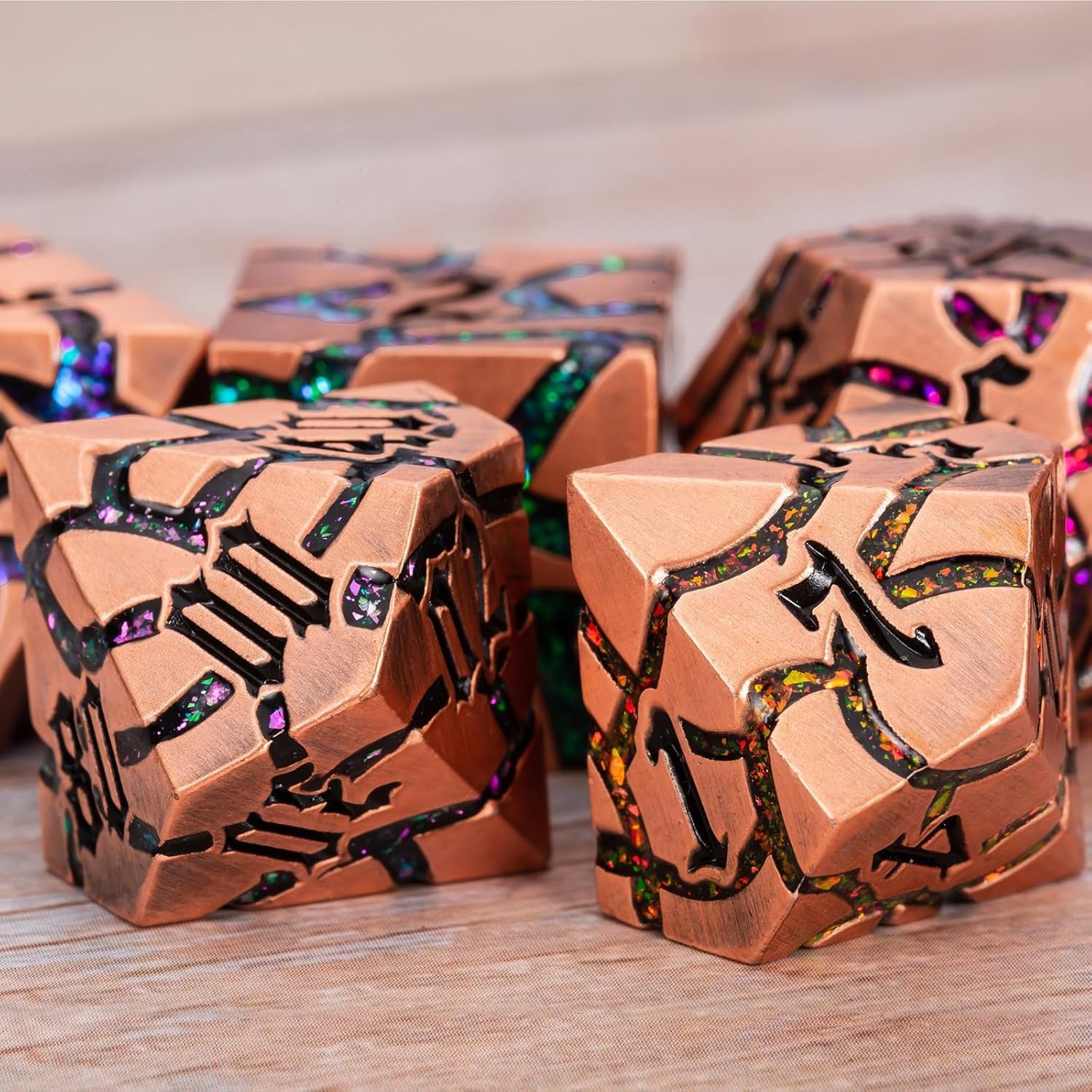 DND Metal Dice Set,7PCS Crack Glitter Metallic Dice with Gift Box,Polyehdral Dice Set for Dungeons and Dragons (Antique Red Copper 7 Colors)