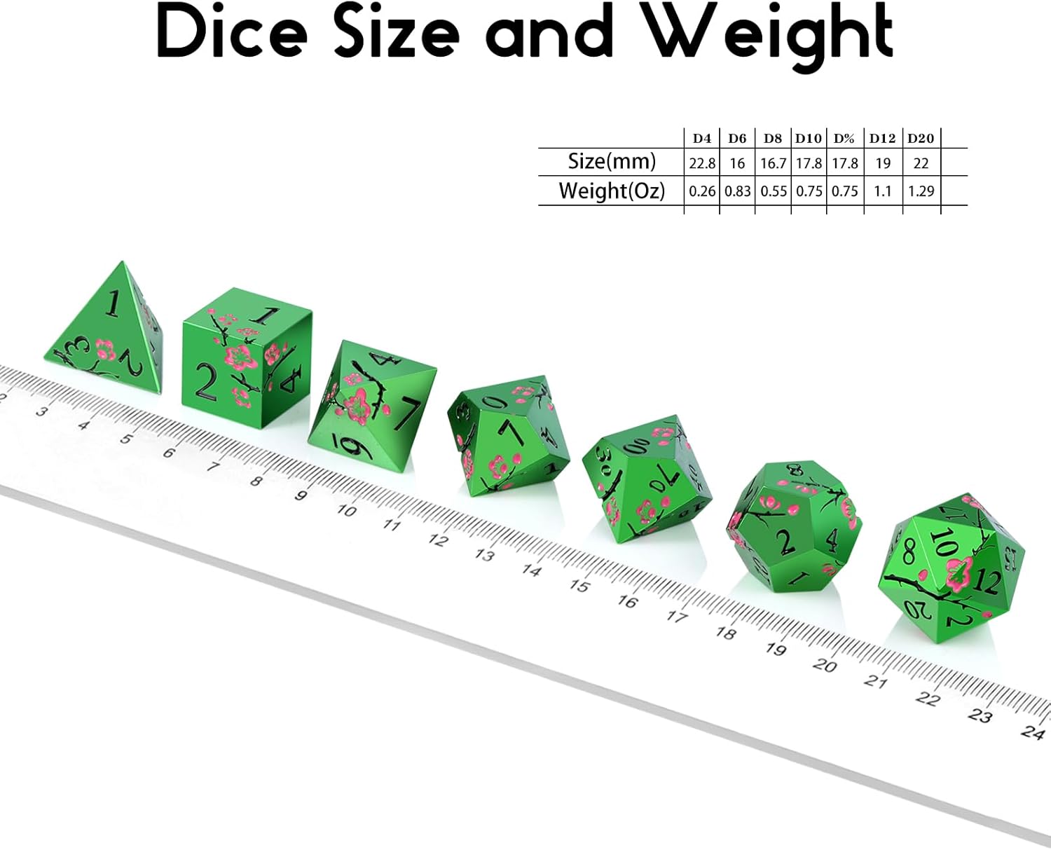 Matt Green Metal Dice Set, DNDND 7 PCS Heavy Metallic D&D Dice Set with Gorgeous Gift Case for Dungeons and Dragon Tabletop Game (Matte Green with Pink Flower)