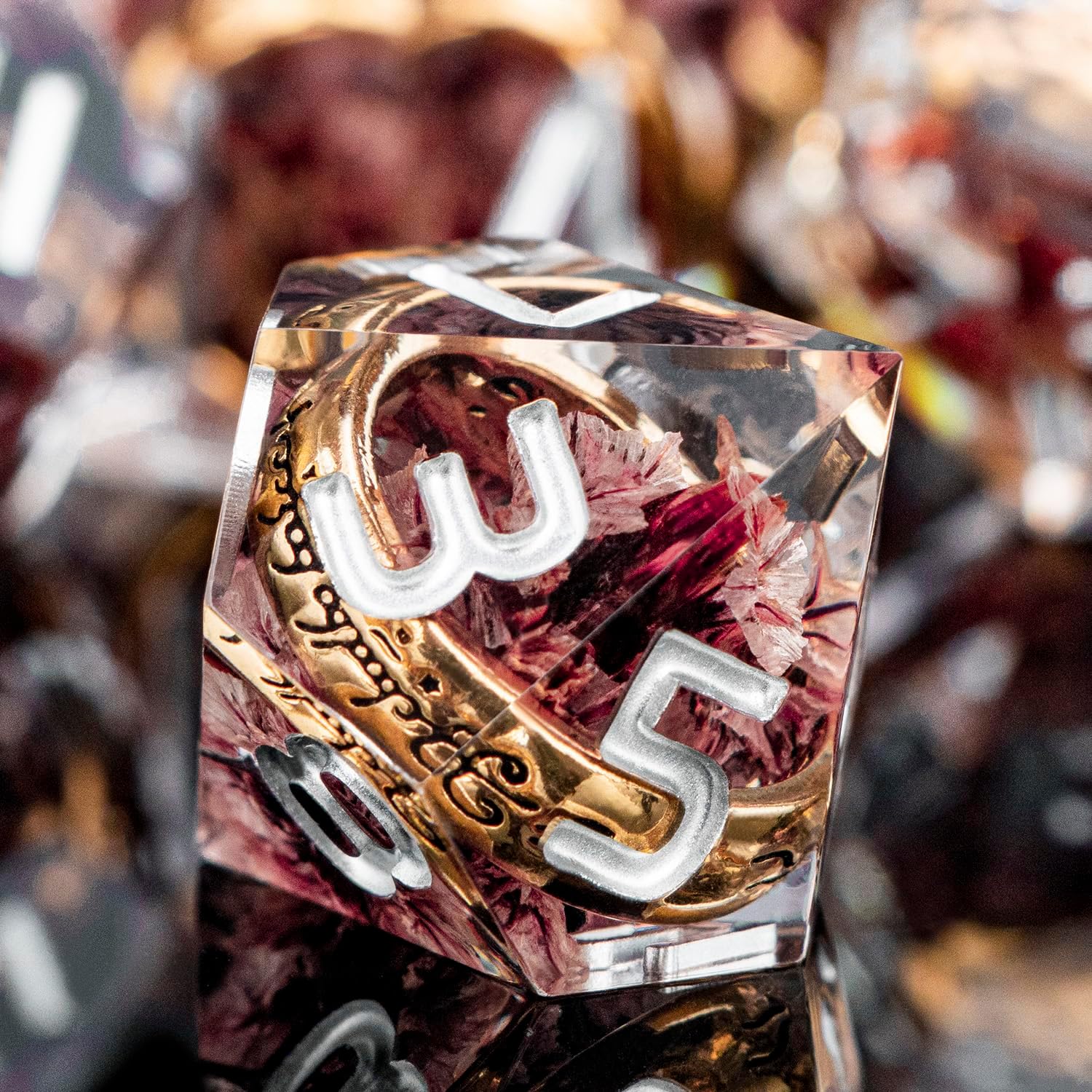 Magic Golden Ring DND Dice Set Sharp Edge Resin Dice with Case, Pink Flower Lord D and D Dice for use with D&D RPG Role Playing Games, Polyhedral Dice Set D20 D12 D10 D8 D6