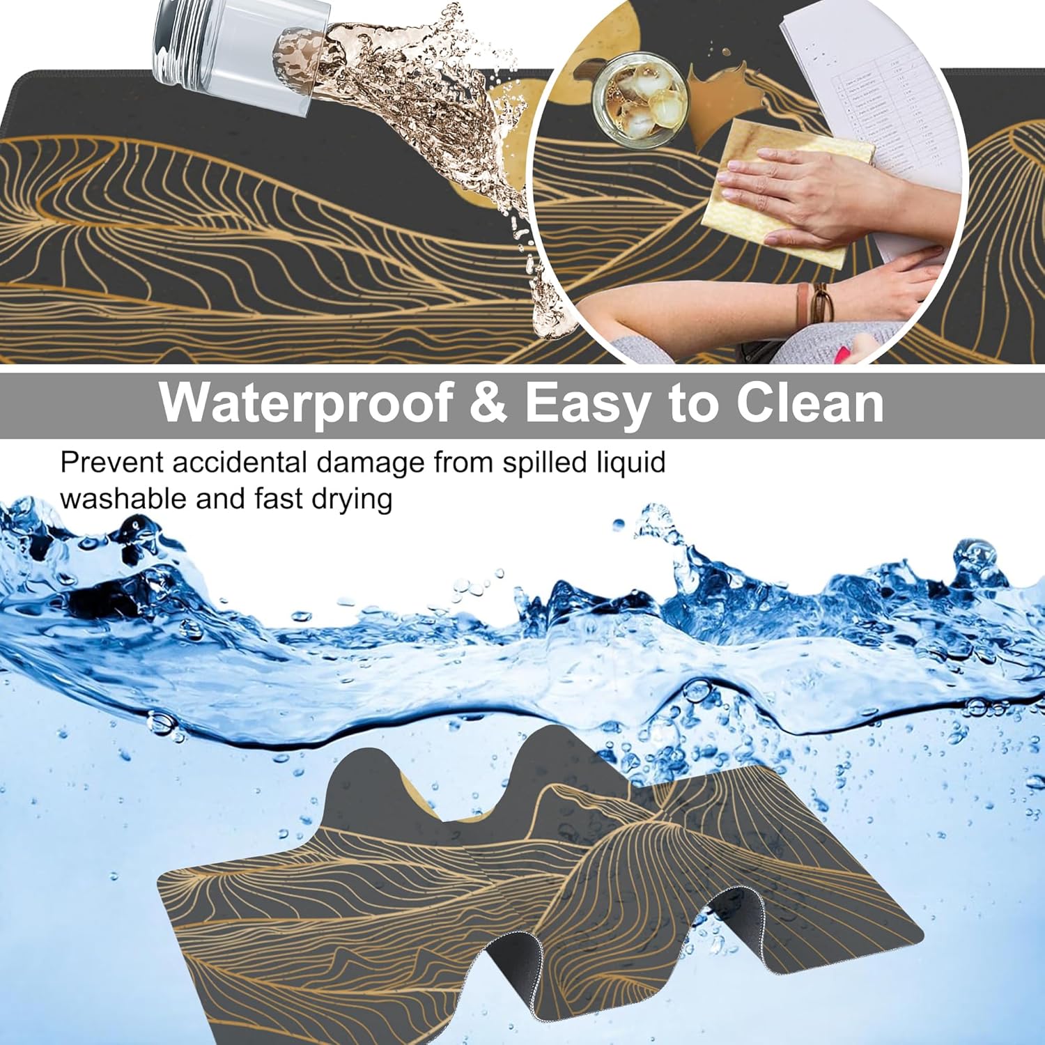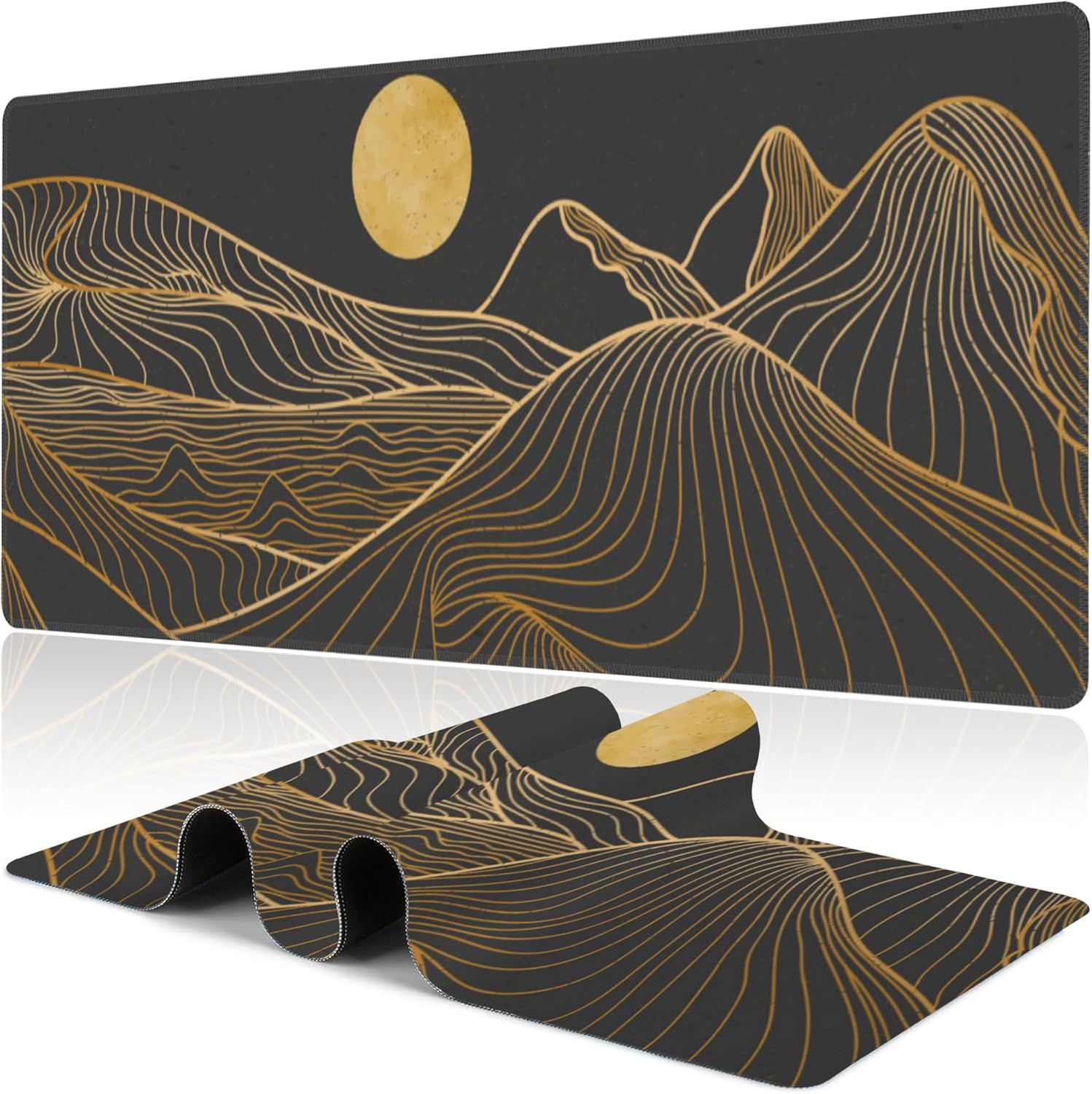 Abstract Golden Mountain Desk Mat,Large Gold Line Art Gaming Keyboard Mouse Pad,Non-Slip Rubber Base Desk Pad Thick Stitched Edges Waterproof Mousepad Mouse Mat 31.5"x11.8"