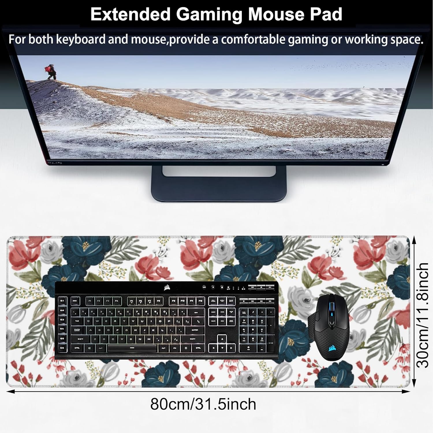 Watercolor Flowers Desk Mat,Large Colorful Floral Gaming Keyboard Mouse Pad,Non-Slip Rubber Base Desk Pad Thick Stitched Edges Waterproof Mousepad Mouse Mat 31.5"x11.8"