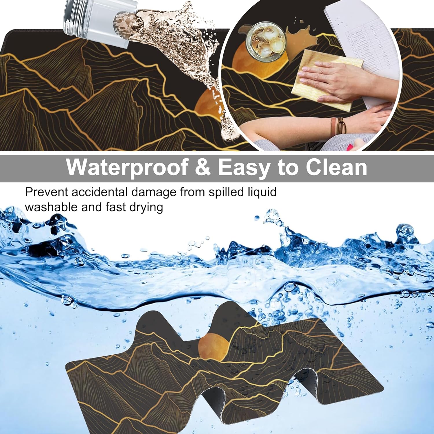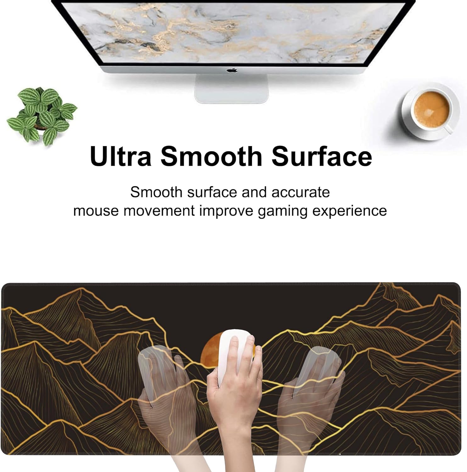 Golden Mountain and Moon Desk Mat,Large Luxury Gold Line Art Gaming Keyboard Mouse Pad,Non-Slip Rubber Base Desk Pad Thick Stitched Edges Waterproof Mousepad Mouse Mat 31.5"x11.8"