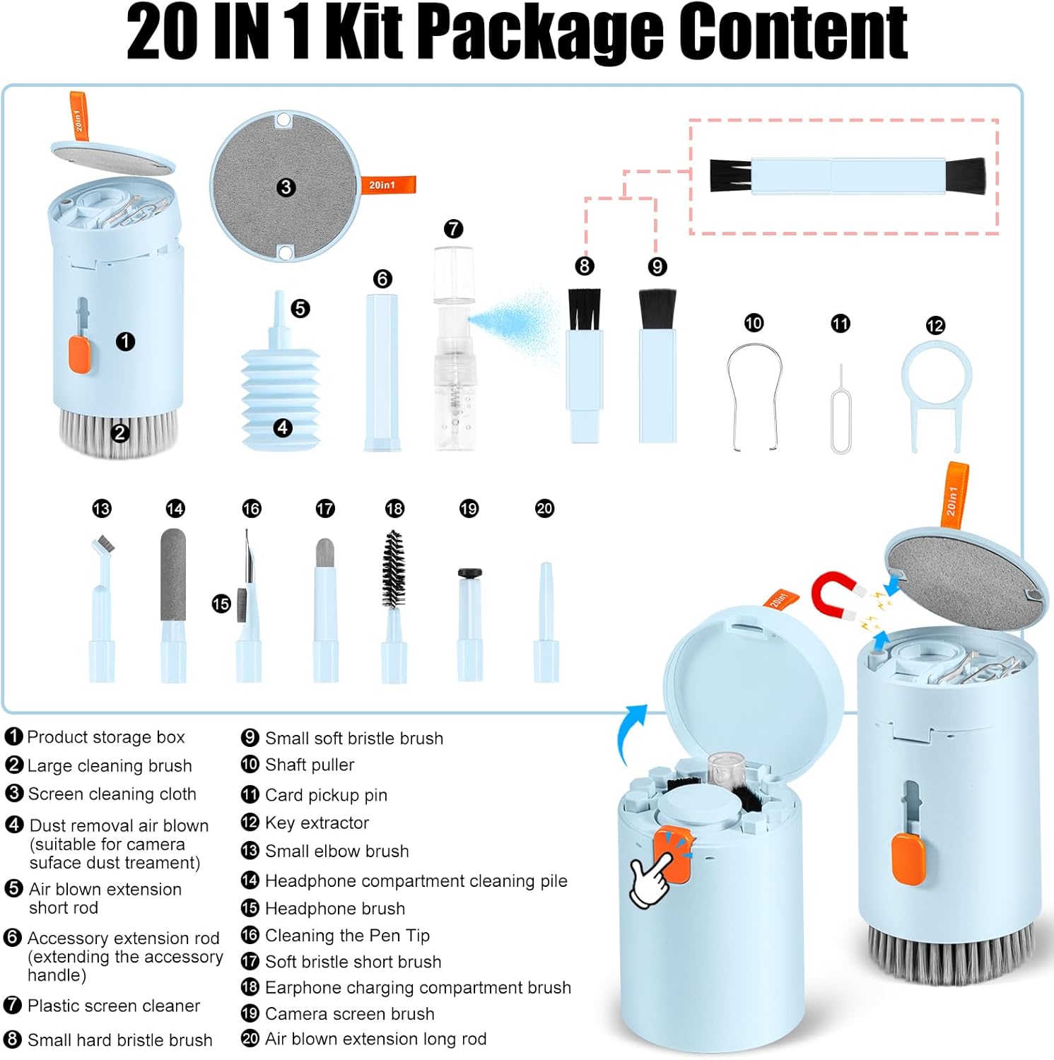 Laptop Phone Screen Cleaner Kit, Computer Keyboard Brush Cleaning Spray for iPhone AirPods MacBook iPad, 20-in-1 Electronic Device Clean Tool for Camera PC Monitor Earbud TV Tablet Car Screens, Blue