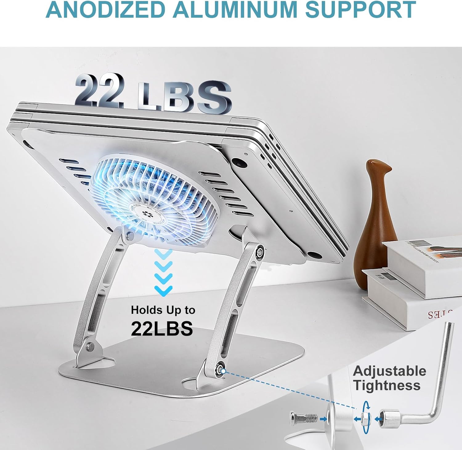 - [Anodized Aluminum Support]-This anodized aluminum laptop stand features a strong bearing force and can support as much as 22 pounds (10 kilograms). The solid base prevents your laptop from tipping over while you're using it, even if you are typing or drawing. Note: We suggest using an external keyboard and mouse so you can type efficiently without the laptop keyboard being wobbly.
