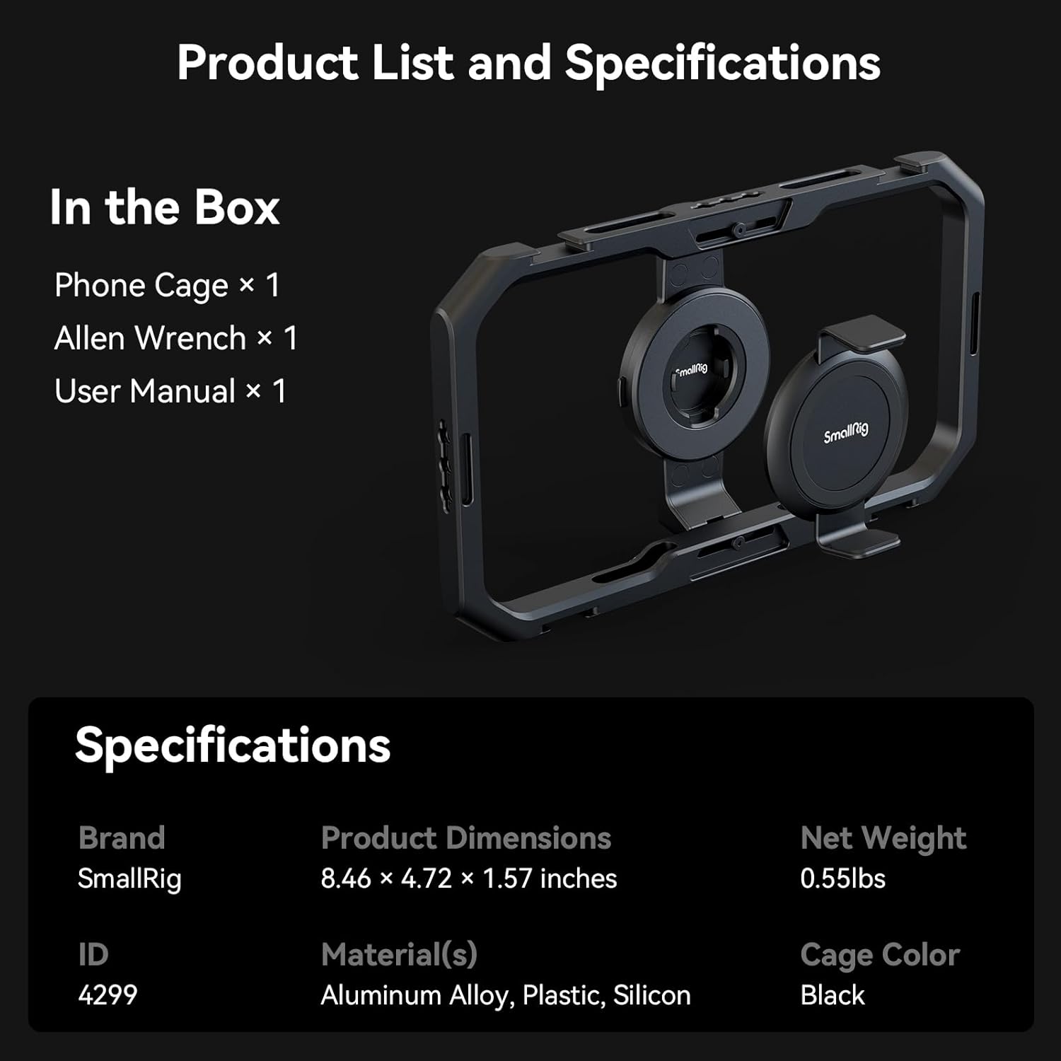 - ăAluminum Alloy MaterialăThe universal mobile phone cage 4299 is made of aluminum alloy to be lightweight yet sturdier. Besides, the built-in rubber pads of phone cage ensure the smartphone in place and away from scratching. SmallRig phone video rig provides a professional and convenient solution for mobile video shooting and live broadcasting.