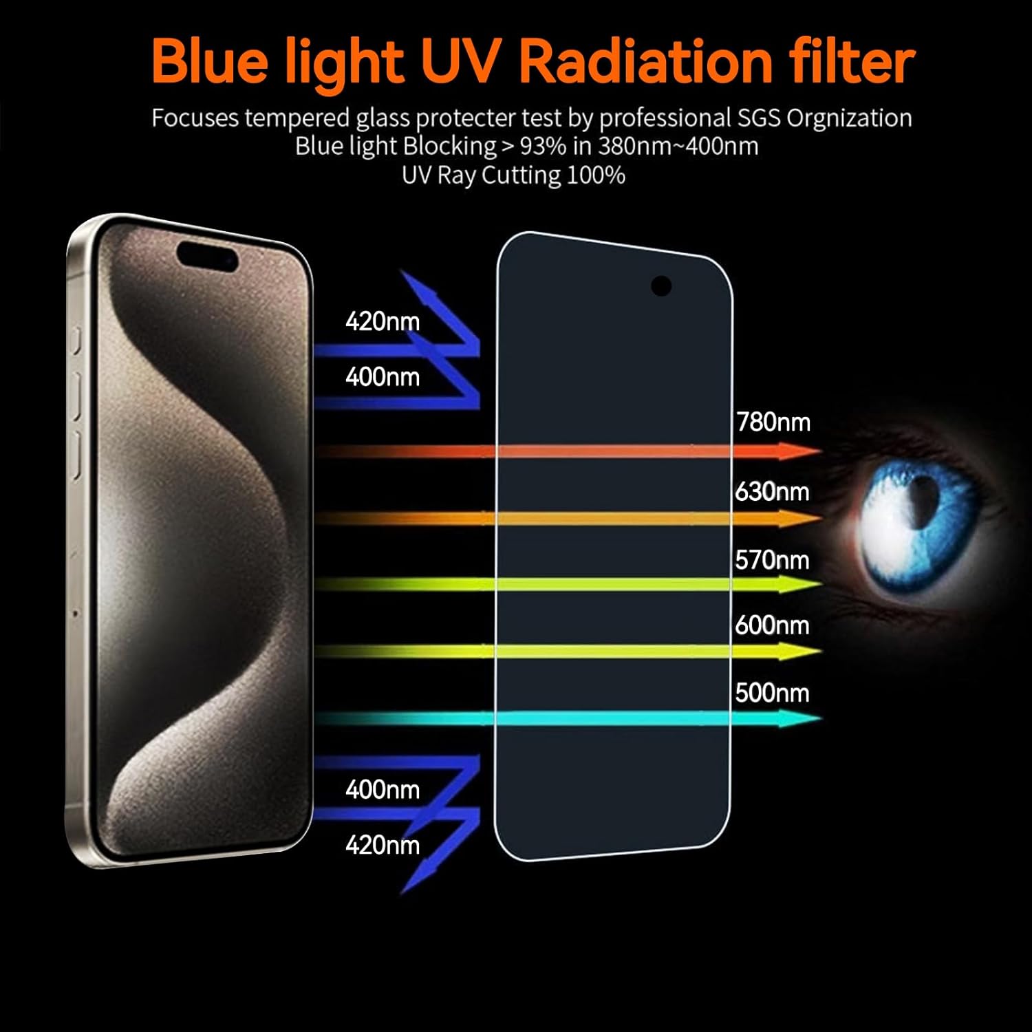 - ăAdvanced anti-blue light TechnologyăScreen Protector for iPhone 15 Pro Max Anti blue ray tempered glass screen protector designed with advanced technology to filter out 90% blue light from the screen, effectively protect your eyes from ocular damage & visual fatigue.