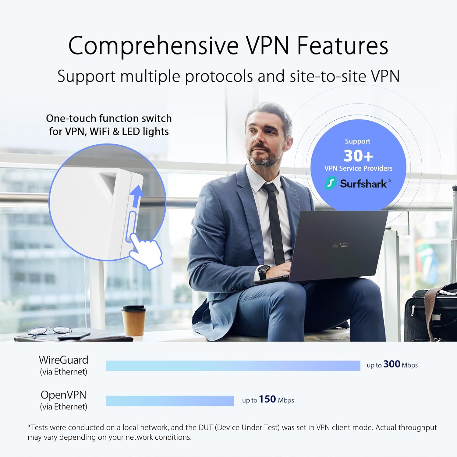 - Subscription-free network security with commercial-grade AiProtection Classic powered by Trend Micro, plus a one-tap security scan and Safe Browsing.