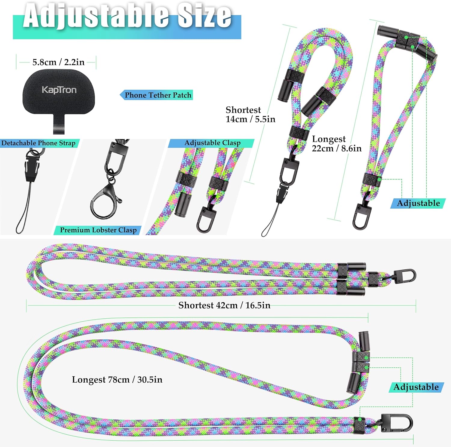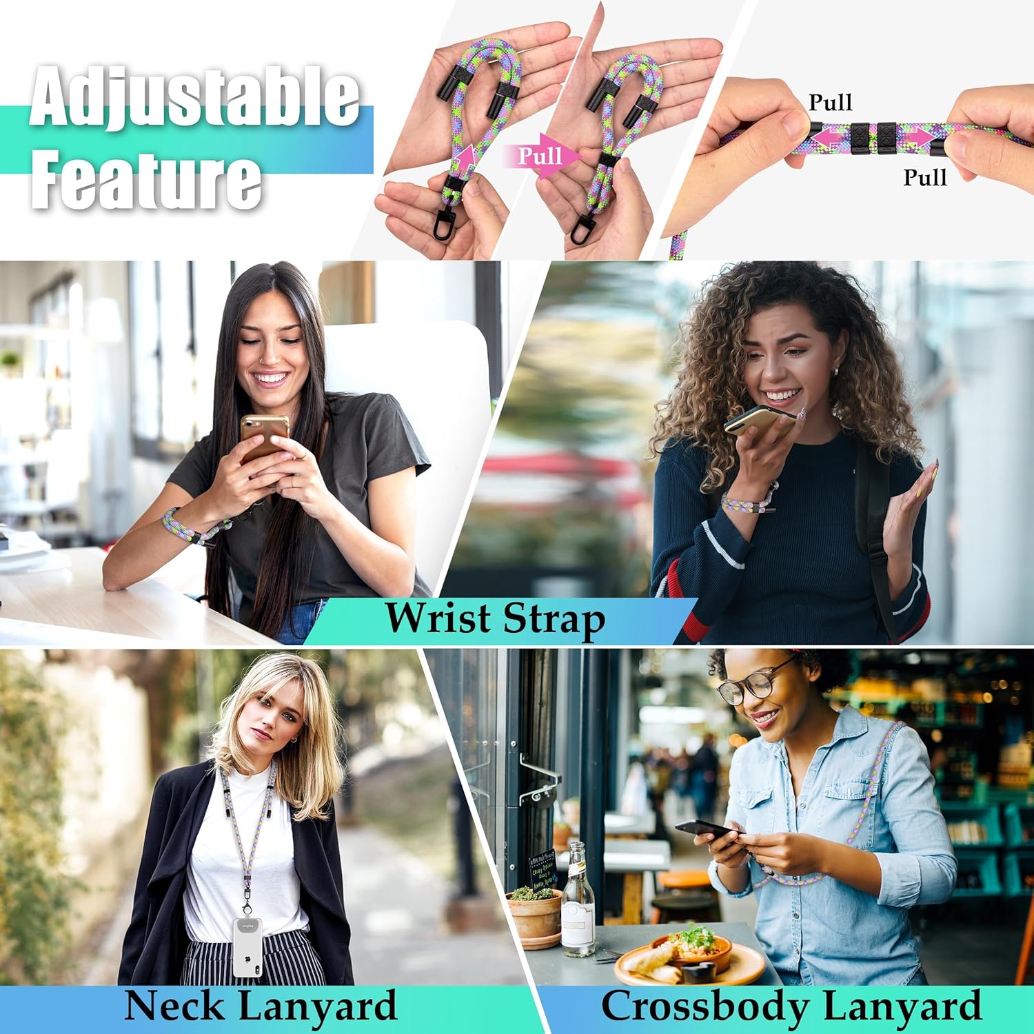 - 【A Bundle of Flexibility】- Cell phones have become a part of everyday life. As your day changes, so does what you are doing. Our adjustable cross body phone lanyard and wrist strap with detachable accessories will enable you to keep your mobile devices and other valuables safe, secure, and accessible. You can keep your hands free while easily adapting to different situations. They are universal for all smartphones.