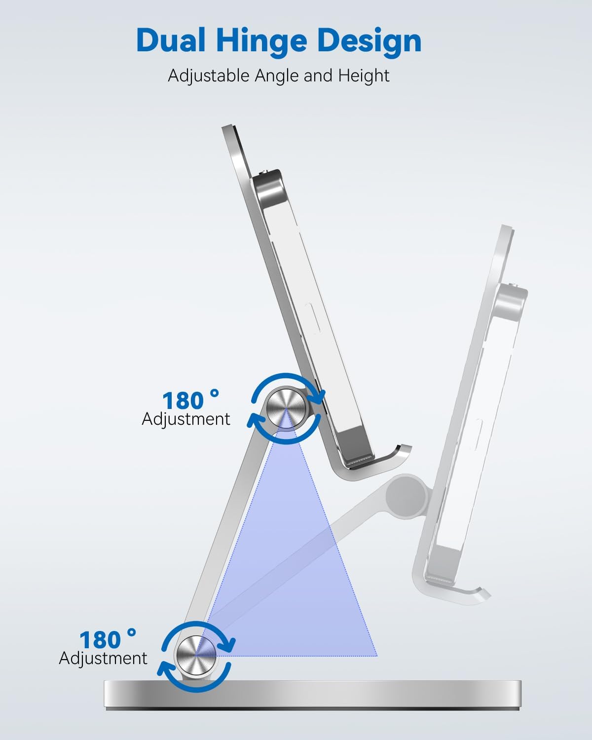 360 Rotating Phone Stand for Desk, Dual-Adjustable Foldable Aluminum Desktop Phone Holder Compatible with iPhone 16 15 14 13 12 11 Series, iPad-Mini, 4-8" All Phones (Silver)