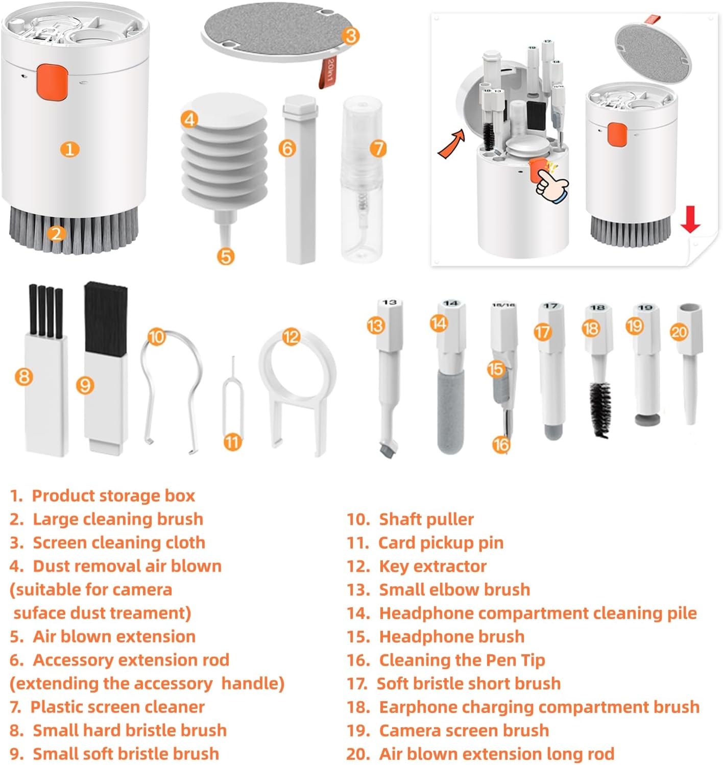 - 🚿【20-in-1 Keyboard Screen Cleaning Kit】: The computer cleaning kit includes retractable large brush, Airpod crevice cleaning pen, mini brush and flocked sponge brush, headphone case cleaning brush, charging port brush and camera screen brush, etc. (all of these brushes have extension rods for easier use). The cleaning kit also includes a screen cleaning cloth and spray bottle, keycap extractor, shaft extractor, 2 extension poles, blower, dual brushes (hard and soft bristle), and a card removal pin.