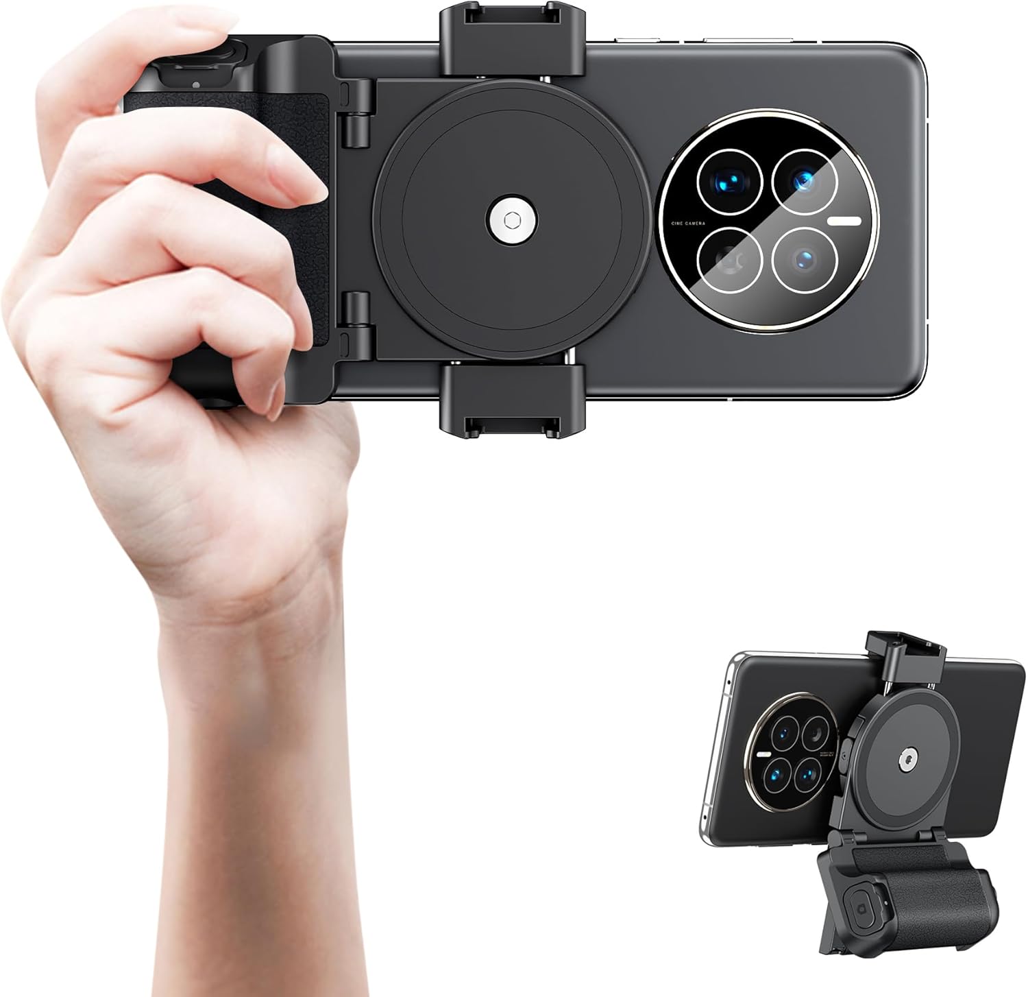 - Designed for Comfort and Convenience: Suitable for smartphones widths: 2.2" to 3.5"/ 55mm -90mm, Inspired by the feel of holding a camera, our ergonomic grip design offers a comfortable hand feel, allowing you to shoot for extended periods without discomfort. The silicone-wrapped grip adds a layer of reliability, ensuring a secure hold while operating. the 1/4"-20 female thread on the bottom lets you mount the grip on a stand or tripod, enabling you to explore new perspectives and unleash your creativity.