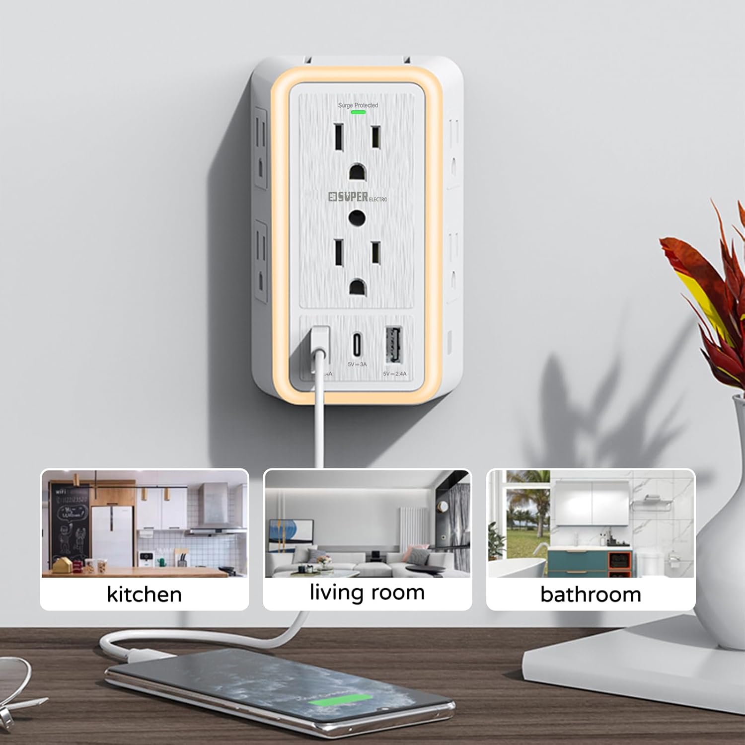 USB Wall Charger Surge Protector, Super Electro 6 Outlet Extender with 3 USB Charging Ports (5V 3.4A Total) and Night Light, 3-Sided 1500J Multi Plug Wall Outlet for Home, Office, ETL Listed