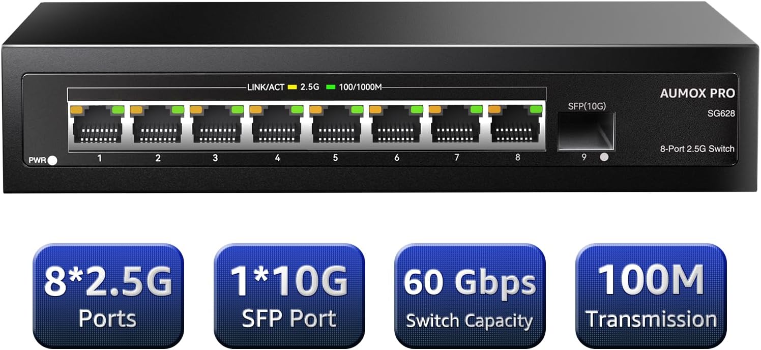 - 【Super-Fast Connections】AUMOX PRO 2.5G ethernet switch delivers 2.5x faster network performance than traditional Gigabit switches. With a switching capacity of up to 60Gbps. Provides super-fast connections to 2.5G NAS, 2.5G Server, gaming computer, 2.5G WiFi 6 AP, 4K video, and more
