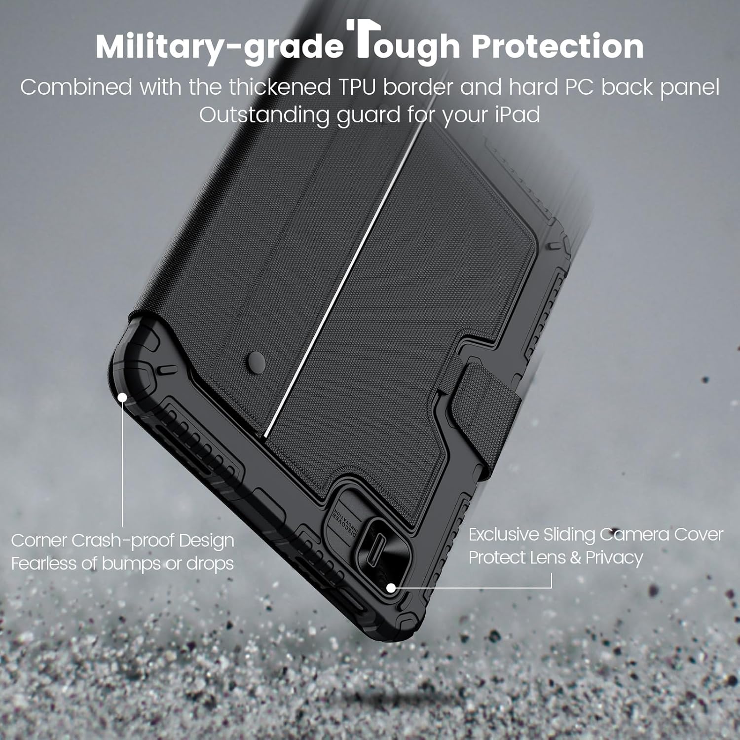 - ăTough Protective CaseăThe heavy-duty thickened TPU frame and PC back, combined with a corner shockproof design, provide full-body military-grade rugged protection for your iPad, safeguarding it from bumps or drops. Unique sliding camera cover protects the lens while keeping your privacy.