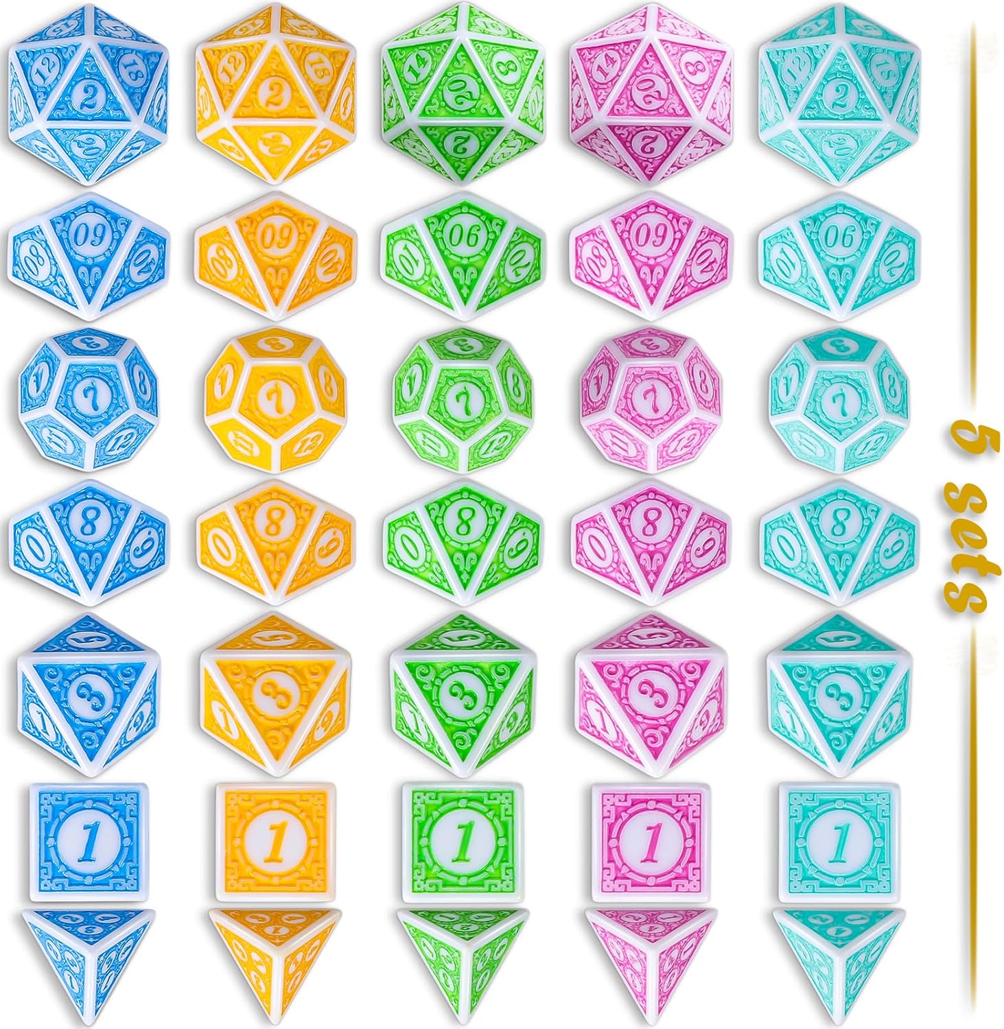 - 🎲Package include - 5 sets of polyhedral dices, each 7-die set contains D4, D6, D8, D10, D%, D12, and D20; 35 Pieces in total. Comes with 5 different colors of drawstring dice bag for easy storage.