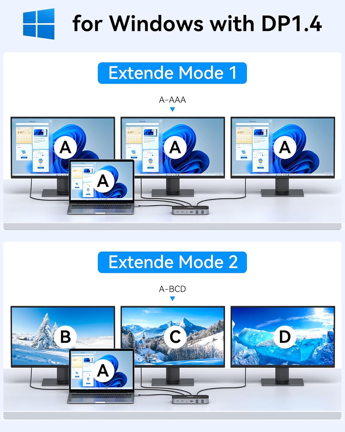 - 【USB C Docking Station 3 Monitors 】With triple hdmi on this hdmi hub for multiple monitors,which can extend 3 monitors at the same time,boost your efficiency 4 times (tRIPLE hdmi+your laptop). Extender 4K@60Hz for one single port max or Triple monitor at 4K@30Hz and dual 1080@60Hz simultaneously.Attention: On Mac devices, ONLY Mirror Mode, CAN NOT extend two different Screen, due to Mac OS limitation