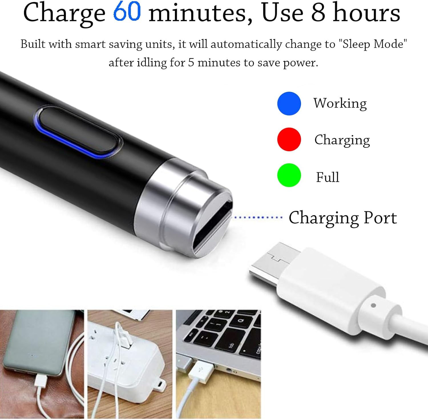- 【User-Friendly Design】 This tablet ipencil does not need to change pencil tip, it can be used directly after power on. This iphone stylus battery last a long time and doesn't take long to charge. The built-in battery can provide 8-10 hours of use time, and use Micro USB can be fully charged in 60-80 minutes. At the same time the rechargeable pen has intelligent power saving function to protect battery life