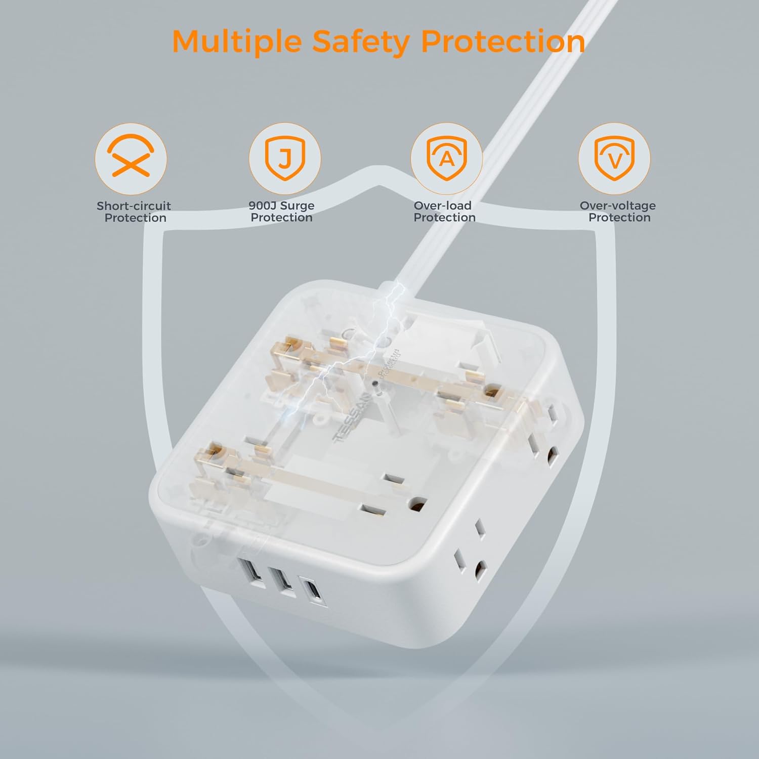 - Surge Protector Power Strip: Equipped with overload protection 900J, short-circuit protection, over-current protection, and etc; Reliable on/ off switch can automatically shut off and protect your expensive electronics, providing you with a safe and reliable charging environment