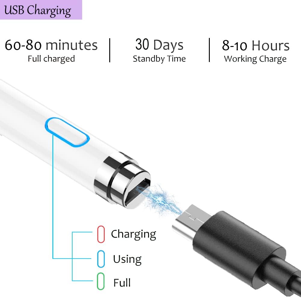 - ăLong-lasting battery lifeă This iphone stylus battery last a long time and doesn't take long to charge. The built-in battery can provide 8-10 hours of use time, and use Micro USB can be fully charged in 60-80 minutes. At the same time the rechargeable pen has intelligent power saving function to protect battery life