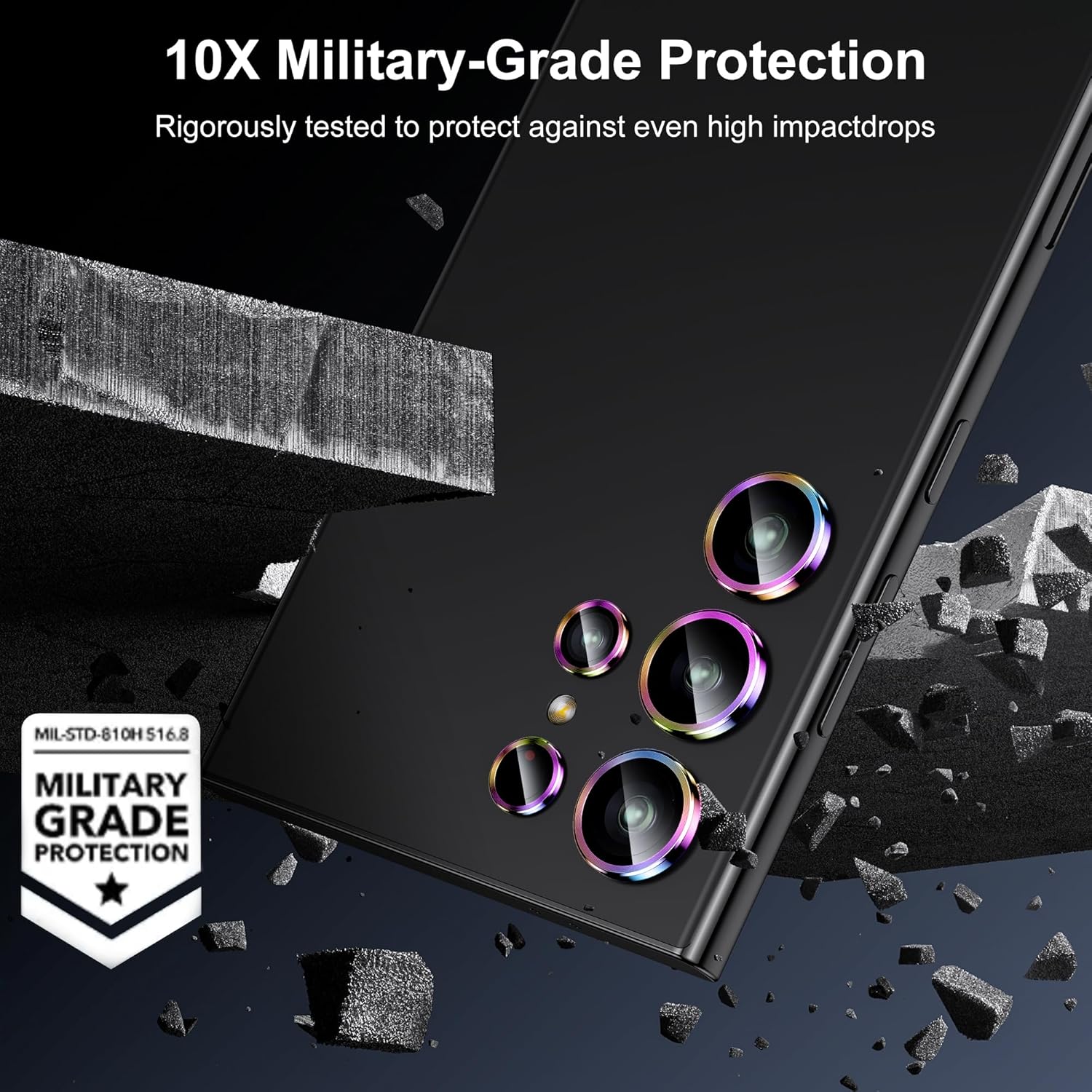 - Military Grade Protection & Anti Fingerprint: Made of space titanium alloy + 9H tempere glass materials, provide powerful scratch resistance against everyday hard and sharp objects. The seal ring is designed to prevent fingerprints, sweat and grease residues. Keep your s24 ultra camera original beauty.