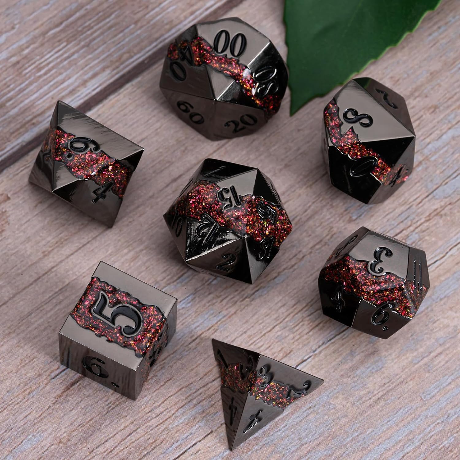 Metal DND Polyhedral Dice,Large Stripe Glitter Metallic Dice Set,Antique Silver Dice 7pcs Set for Role Playing Games(Black Nickel Red)