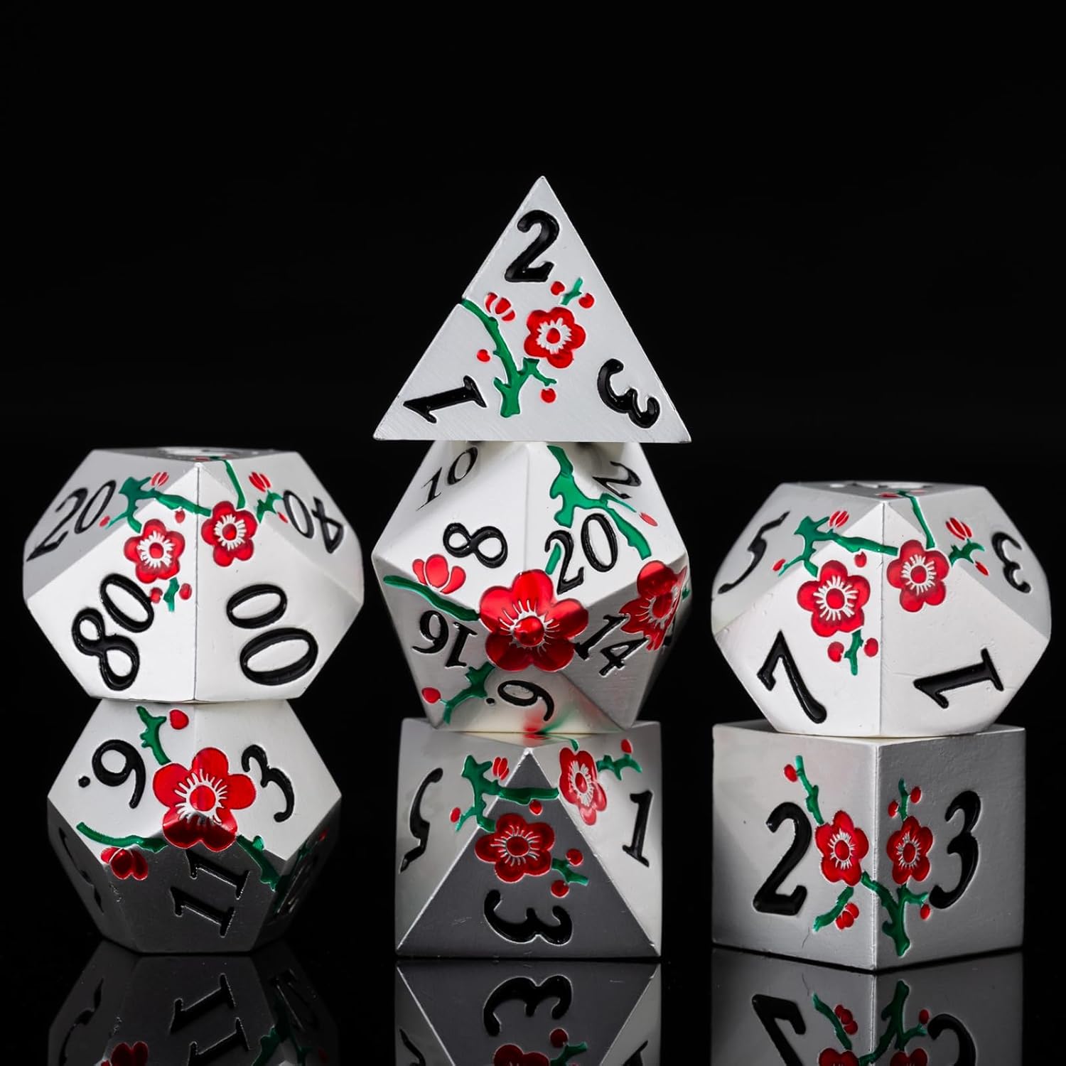 Metal Dice Set D&D, 7 PCS Flower Metal DND Polyhedral Dice Set with Box for Dungeons and Dragon Tabletop Game (Silver-red-Green)