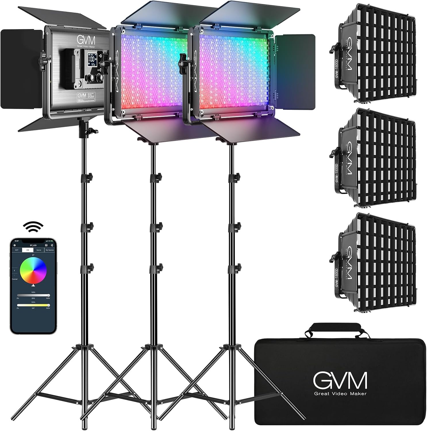 - 1300D Video Lighting Kit: 3 * GVM 1300D RGB LED Video Lights with U Bracket and Barn Door; 3 * power cord; 3 * power adapter; 3 * white diffuser; 3 * light stand; 3 * Softbox for gvm light; 1 * carry bag