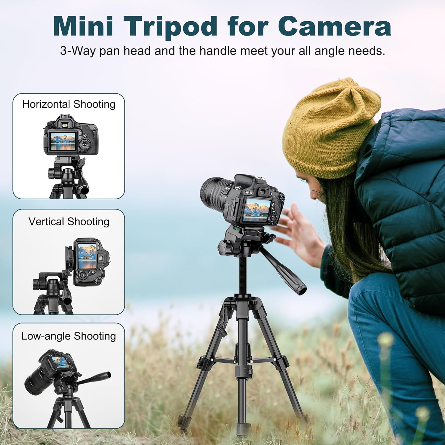 - 【Versatile Shooting Angles】Phone camera tripod is equipped with a stable and smooth 3-way pan head, giving you a flexible shooting experience. Compact tripod for camera supports horizontal, vertical, overhead and 360° panoramic shooting, achieving multi-angle shooting and capturing moments with ease.