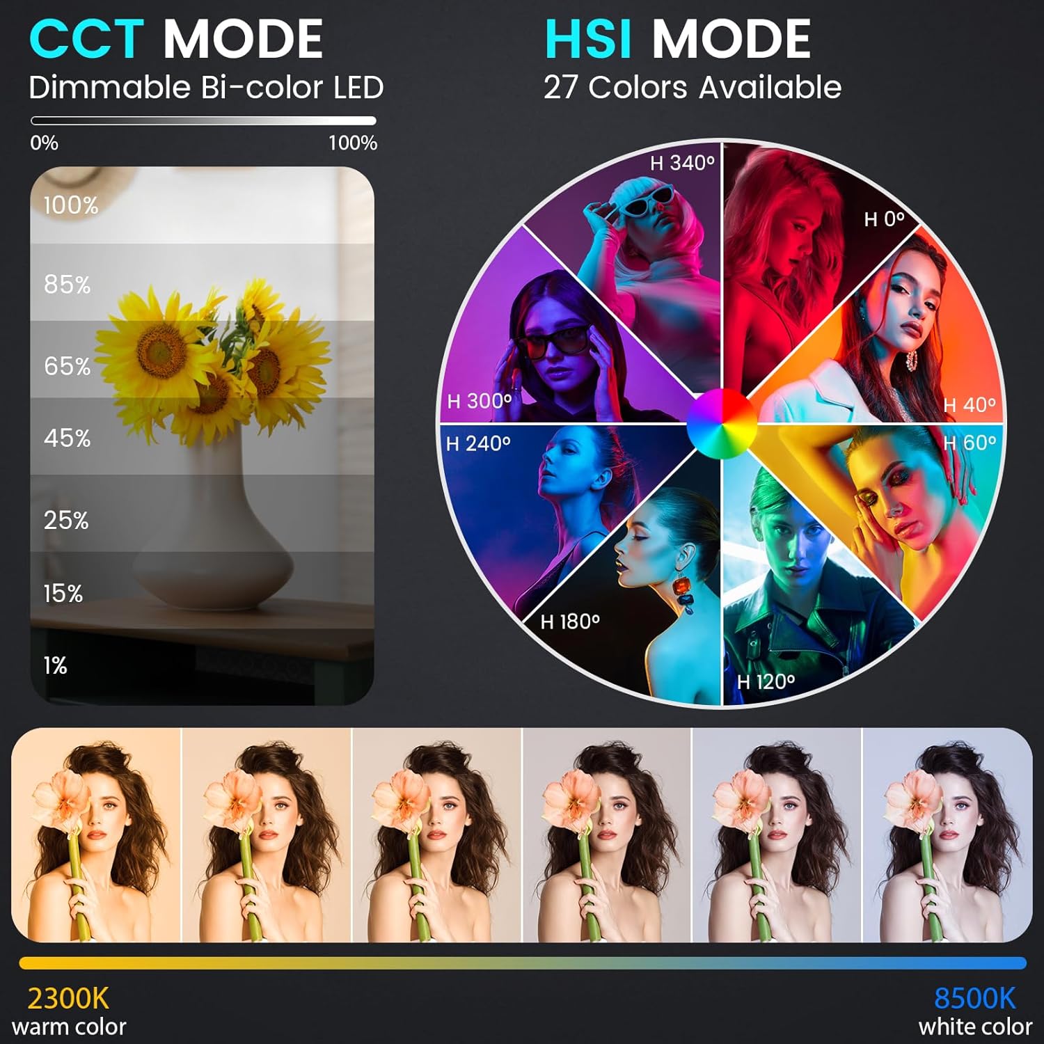 - 【Bi-Color Mode& RGB Colors】 With 252 warm white LEDS, 252 cool white LEDs, 140 RGB LEDs, this 50W 644 LEDs Video Light features a max illuminance of 3800 lux/1m, 2300k~8500k adjustable color temperature, 27 colors mode and 0%–100% adjustable brightness.